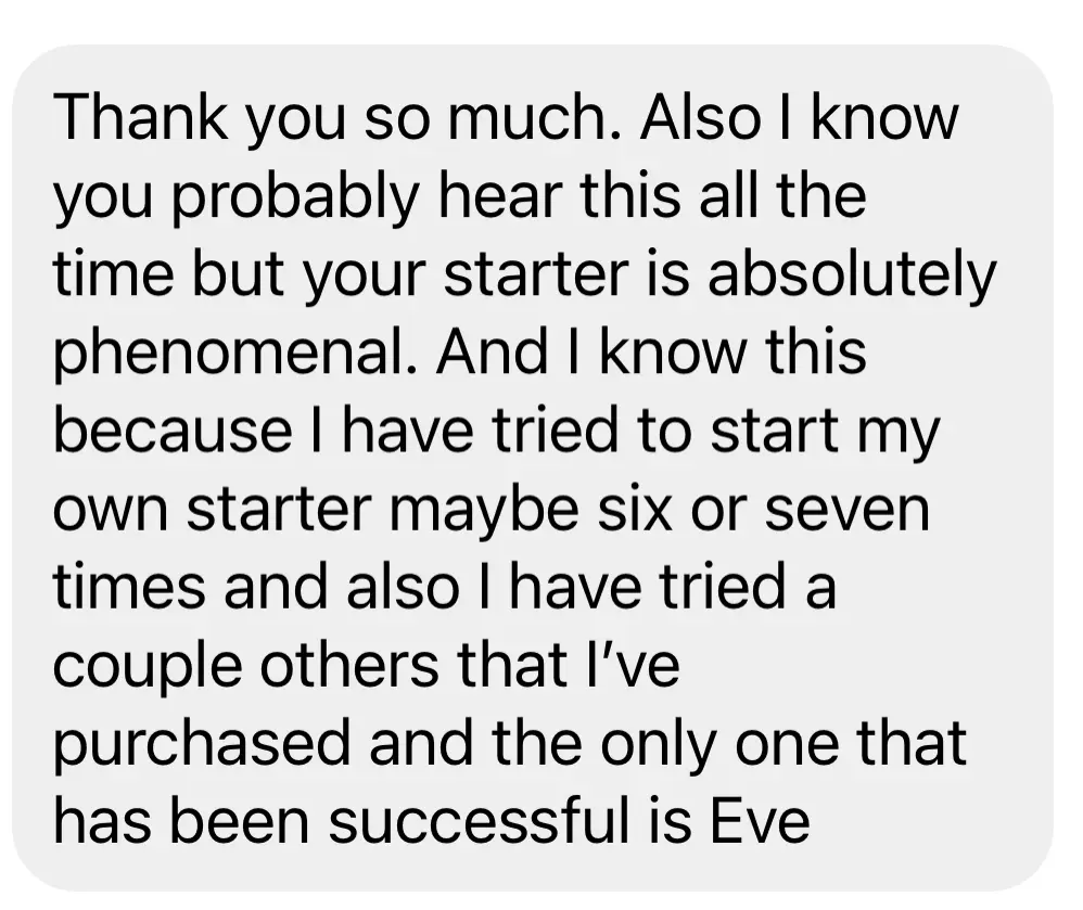 What else should I say? I run a business off of Eve! 10000000/10! Don’t stress over trying to nail your own starter just buy Eve!