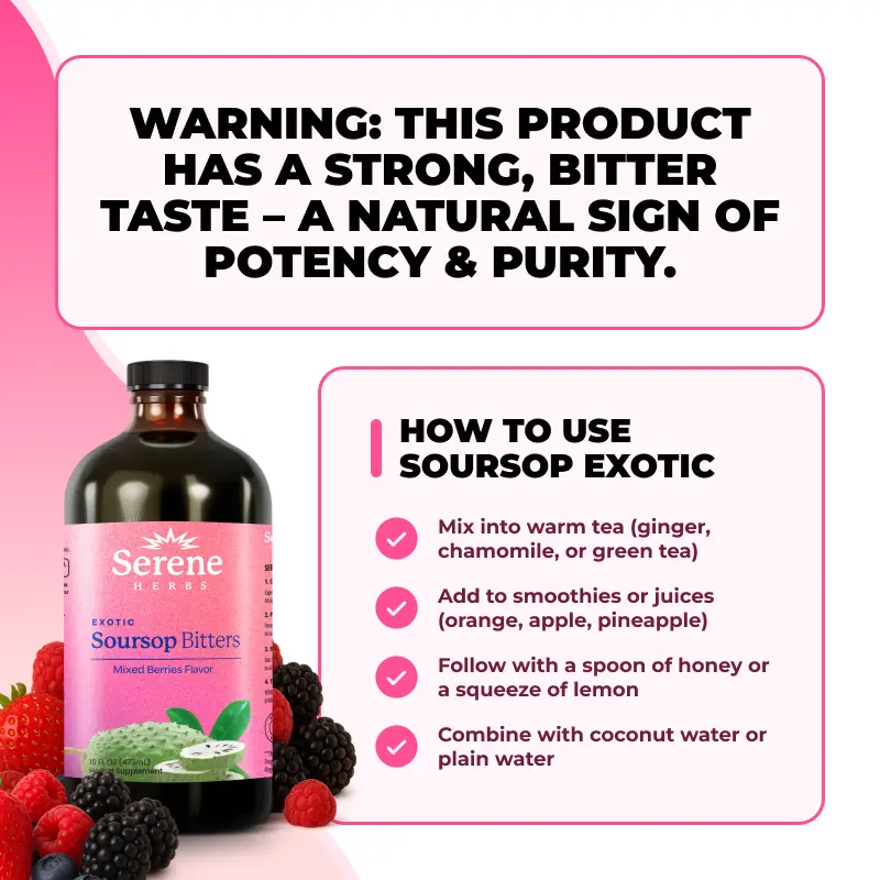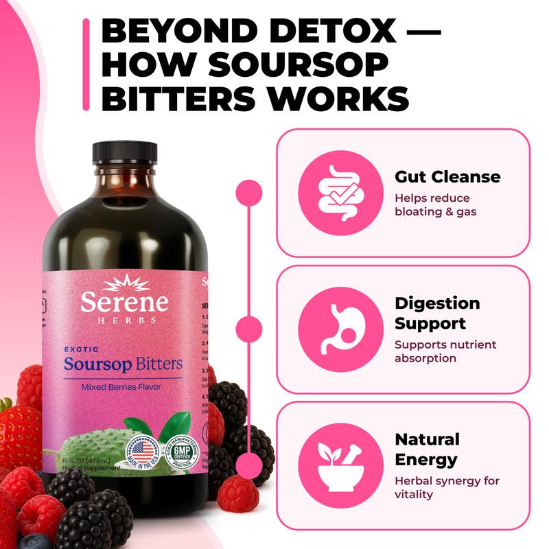 ·Soursop Bitters with Soursop Tea Leaves for Immune Support by Serene Herbs: Discover the powerful synergy of over 15 natural herbs in our expertly crafted formula. Anchored by soursop, this blend is enhanced with potent ingredients like black seed, sea moss, ginger, turmeric, ashwagandha, Irish moss, senna, and more. Designed for your convenience, this blend supports overall wellness.