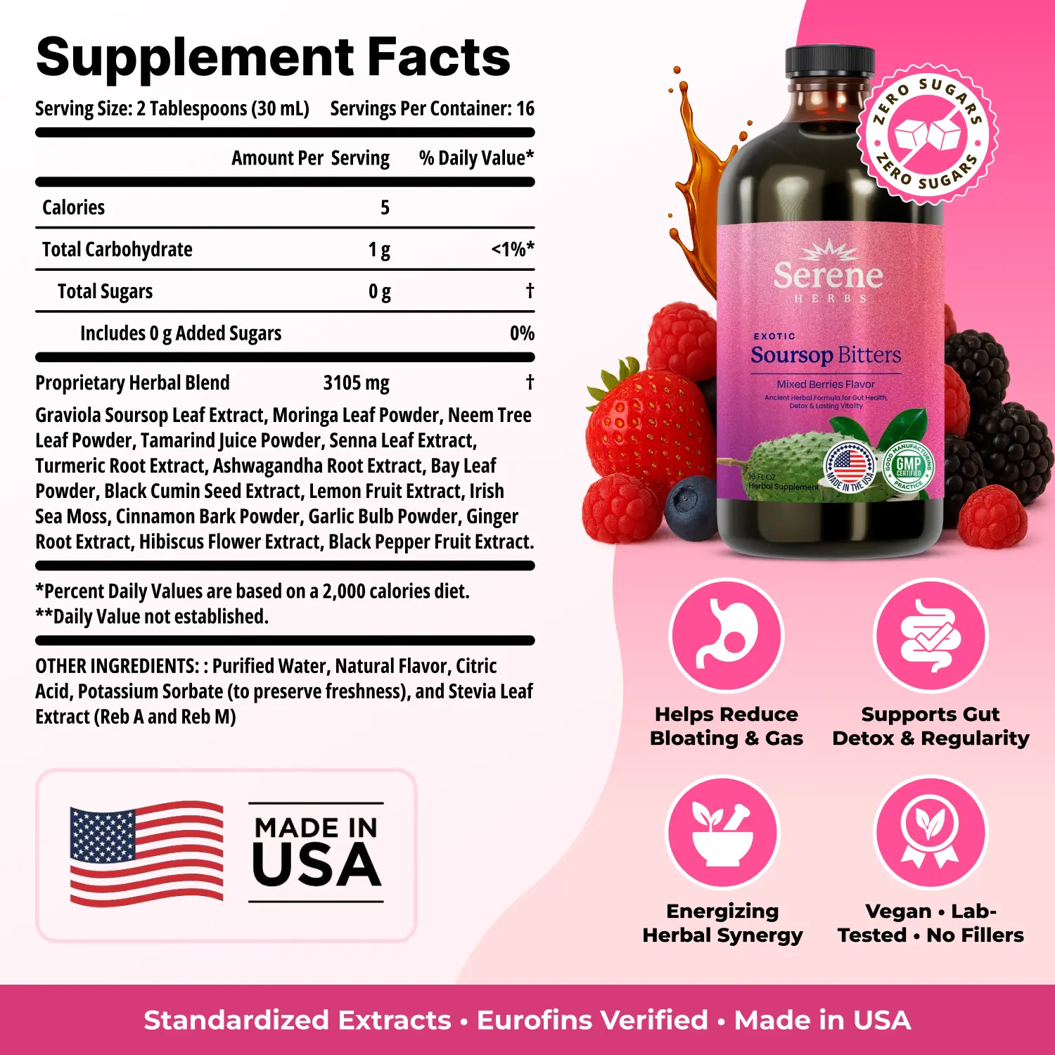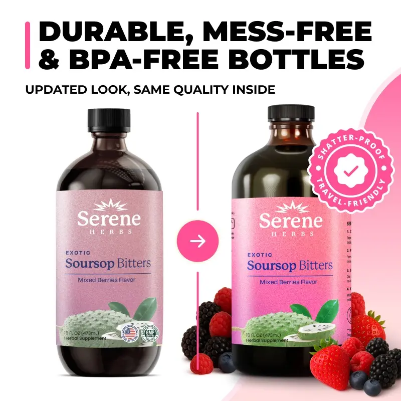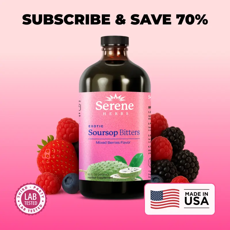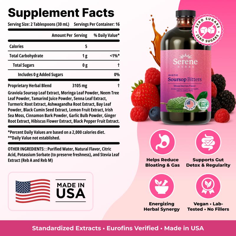 ·Trusted Third-Party Validation: Our Serene Herbs Soursop Bitters 15-in-1 Liquid Bitters undergo rigorous testing by independent laboratories in the USA, ensuring top-tier quality and purity, free from contaminants. Each product—whether it's our soursop bitters, capsules, or other offerings—are carefully crafted in a certified, state-of-the-art facility in the USA. We prioritize your health by excluding unnecessary preservatives and fillers, delivering only the purest and most potent ingredients.