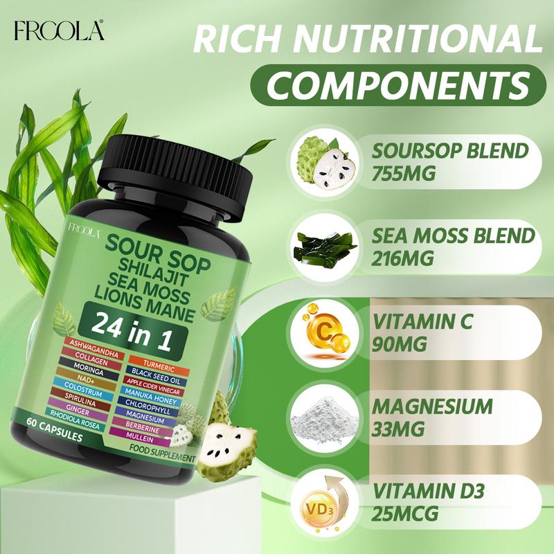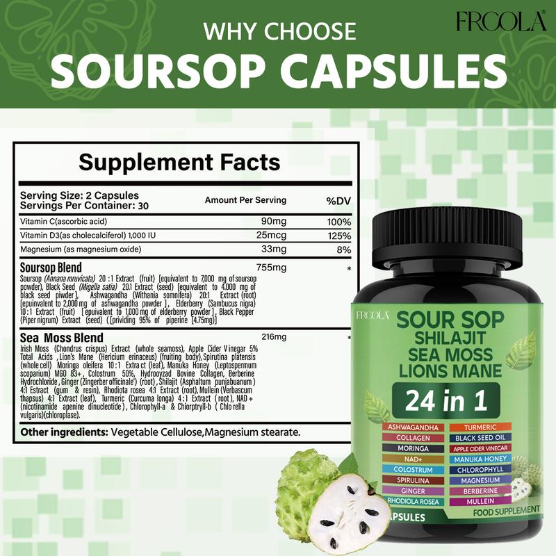 I love this supplement that contains soursop and 23 more supplements all in 1 tablet. It helps everything from mental sharpness, your immune system, and energy levels! Great multi supplement, will buy again!