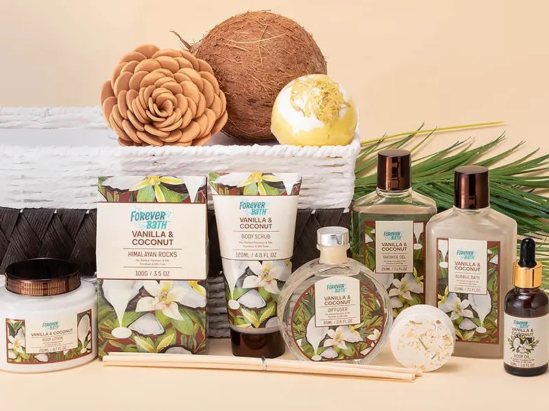 At FOREVER BATH, self-care should be a priority, so we have curated the ultimate Vanilla & Coconut bath sets for women. This exquisite 11-piece home spa set is designed to provide you with a complete & indulgent bathing experience.