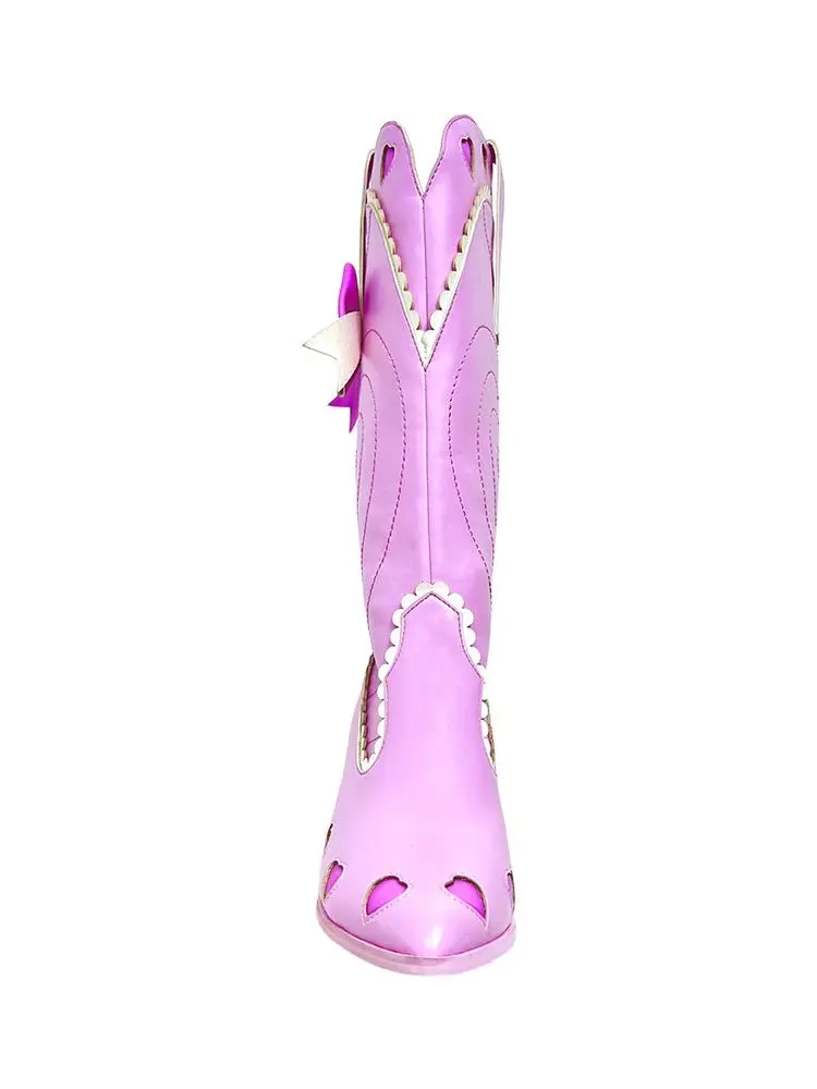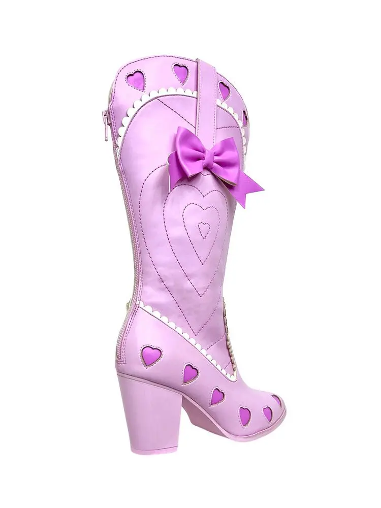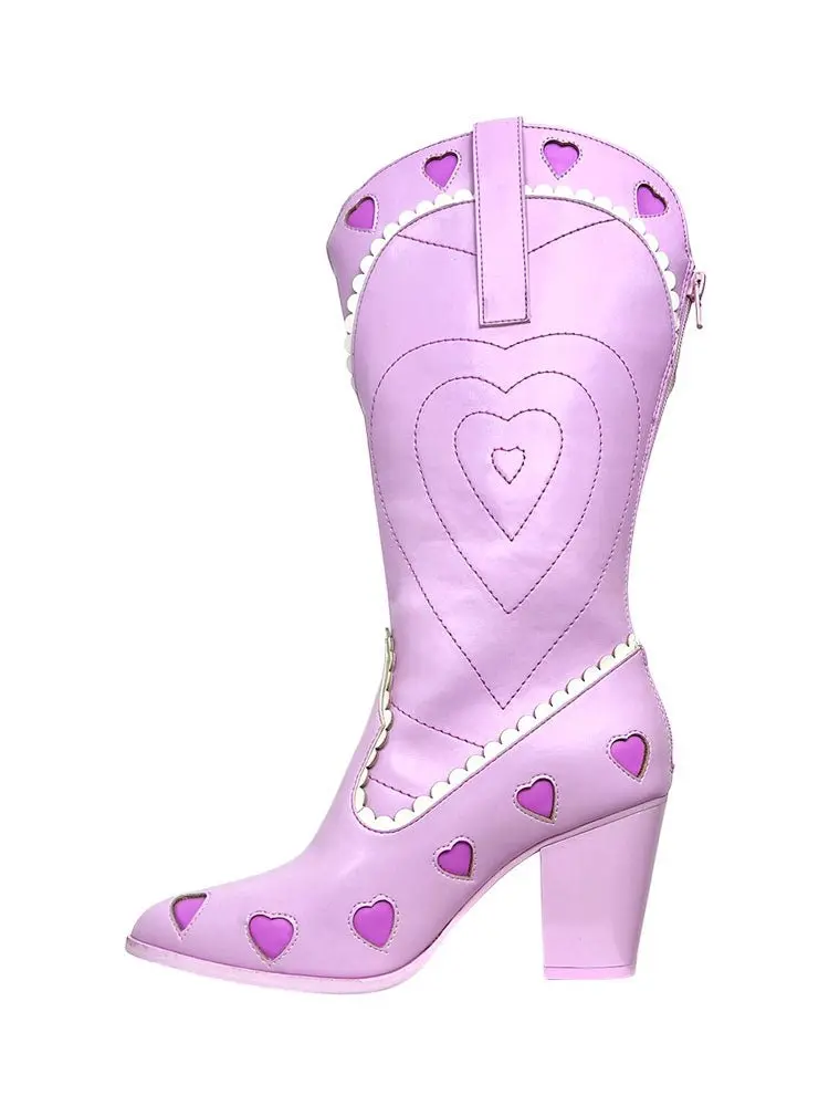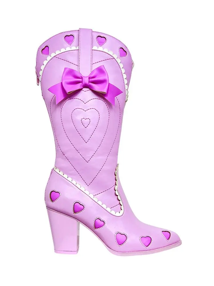 Introducing the SPACE COWGIRL LOLITA - PINK, the perfect combination of coquette cowgirl style and feminine details. The pink vegan leather upper features scalloped edges and heart cut out details, while the back zipper closure ensures a secure fit. With a comfortable 3 inch heel, you can rock this cutesy look all day long.