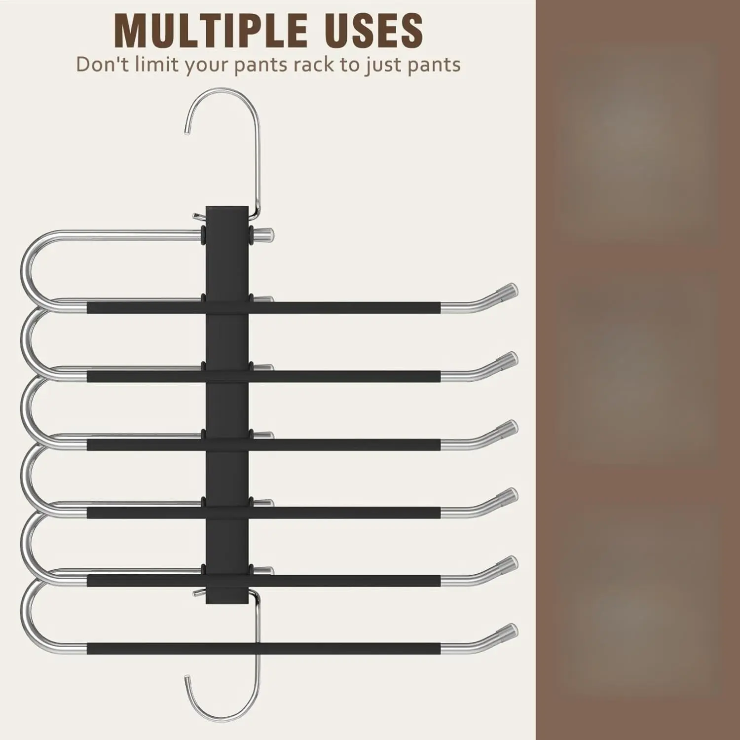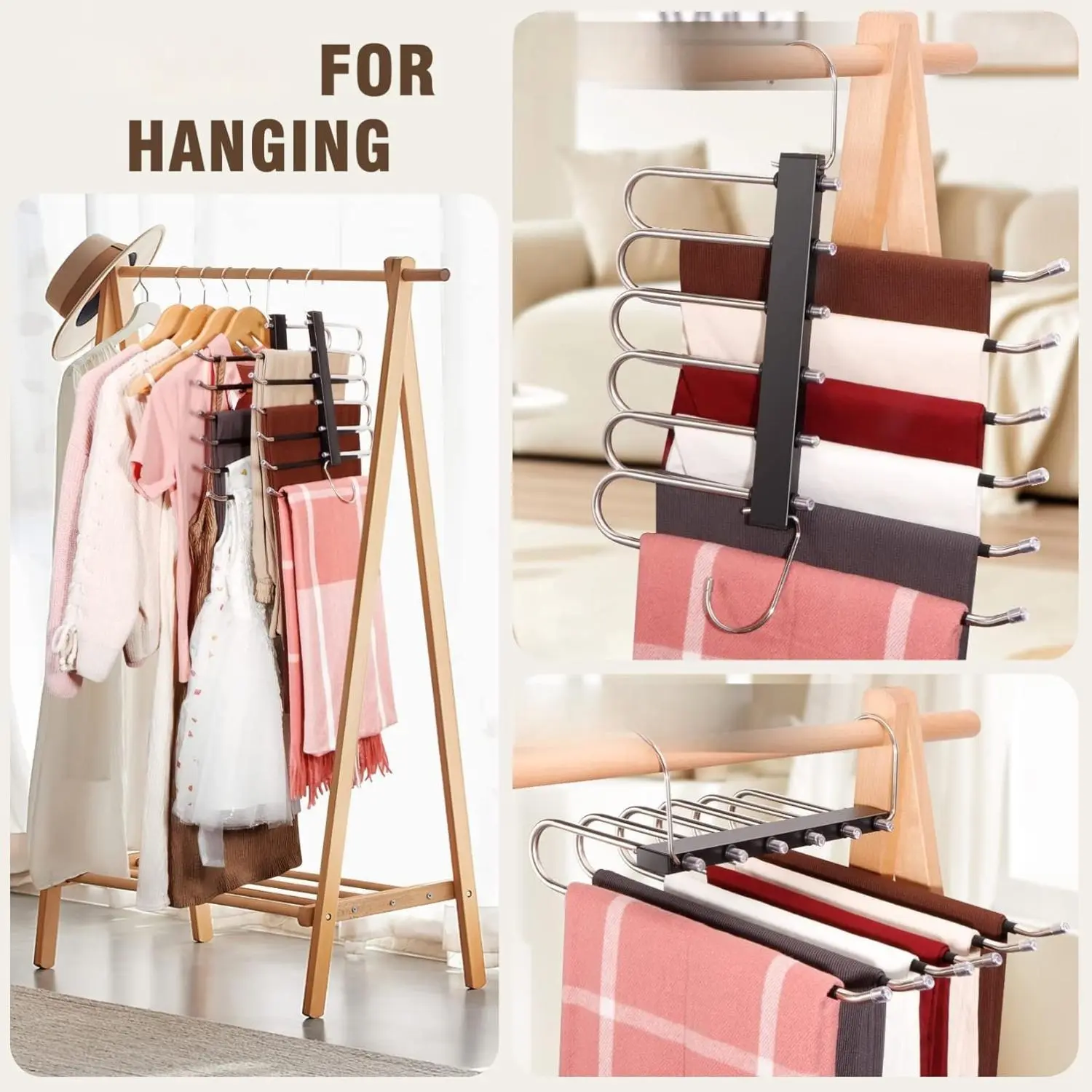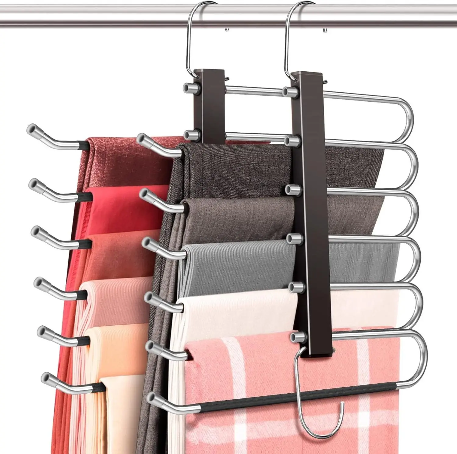 ·Convenient Pre-Set & Open-Ended Design : Does does not require any installation and is ready to use the multiple pant hangers for closet. Easily place and retrieve your clothes with the open-ended design, perfect for daily use and storage. These multi purpose hanger feature an open end for easy hanging skirts, pants, towels, linens, and scarves! Suit for men and women. Anti-slip rings on each rod prevent abnormal sliding of the hanger.