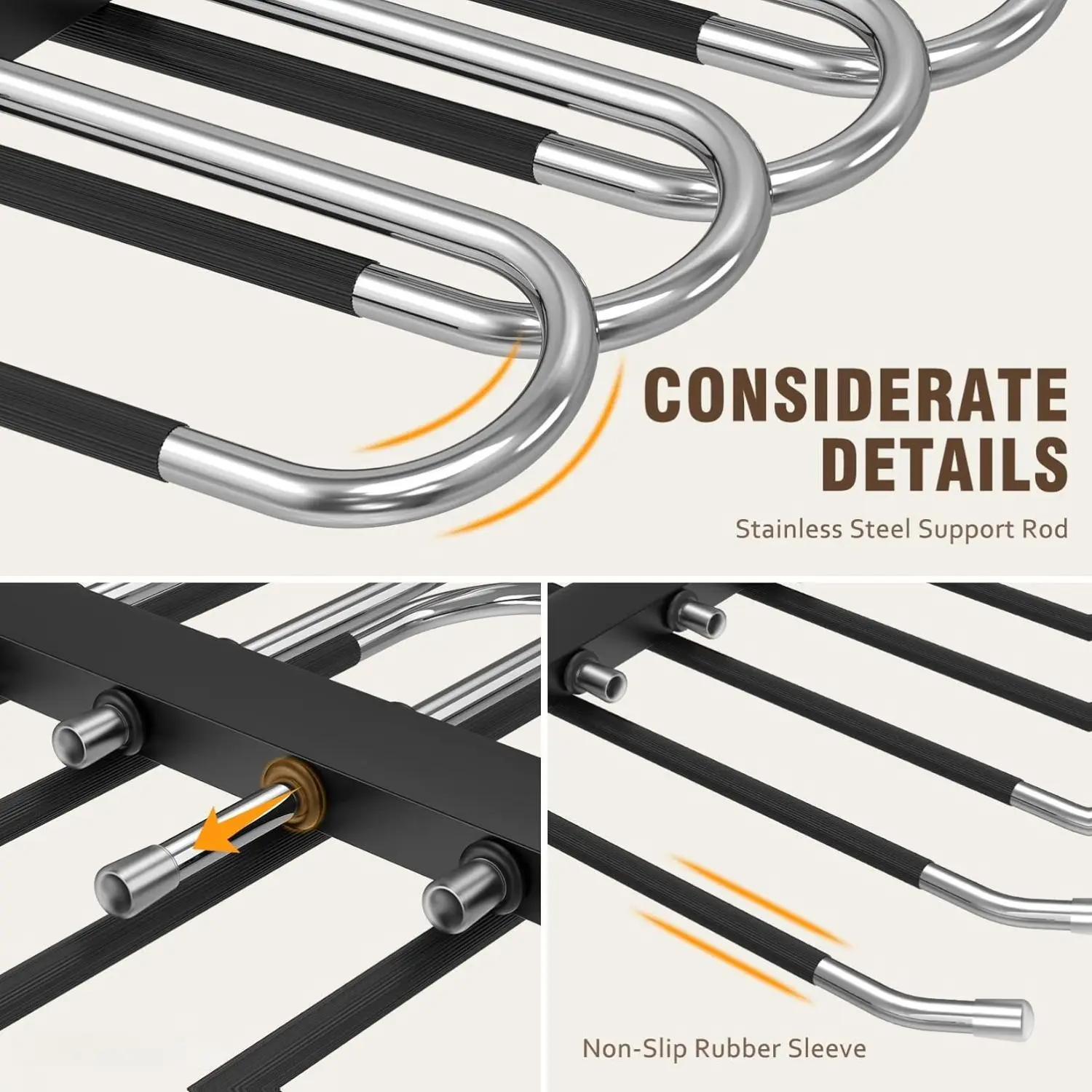 ·Durable & Lightweight : Made of high-grade anti-rust stainless steel, the sturdy metal frame ensures the multipurpose hanger retains its shape and can carry up to 12 pants. our hangers for pants are built to last. They can handle even heavy-duty pants without bending or losing shape, while still being lightweight and easy to handle. And non-slip rubber sleeve keeps clothes wrinkle-free.