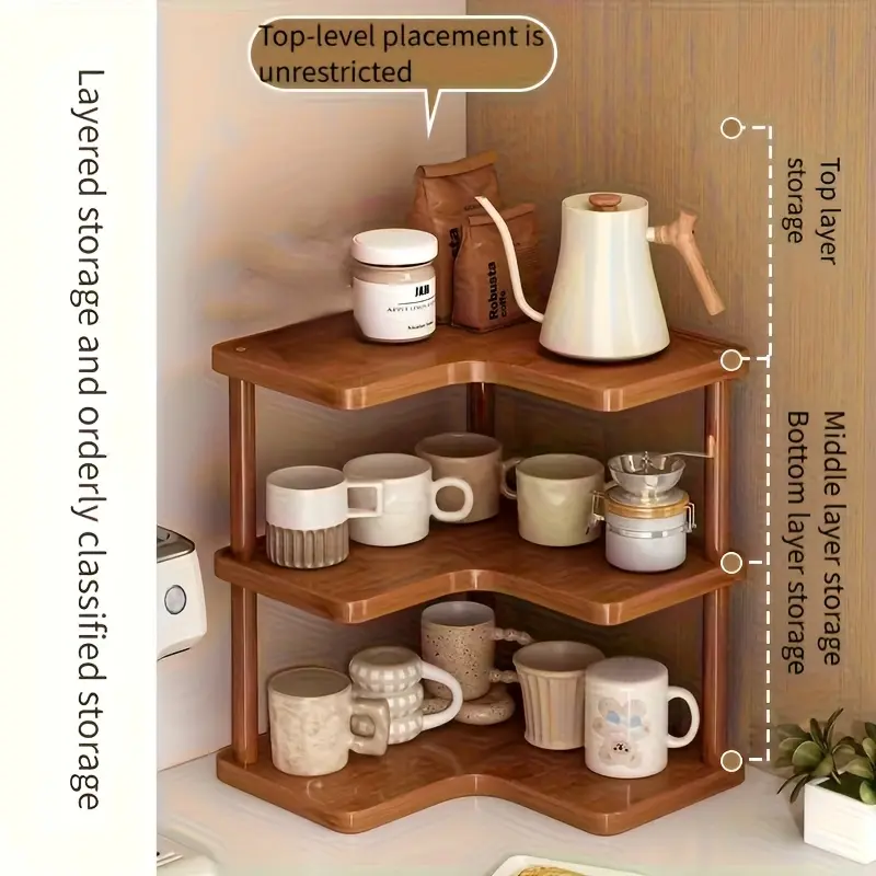 Space-saving curved corner shelf, multi-layer countertops, cabinets, laundry storage units, easy-to-assemble corner shelves, suitable for small spaces, coffee station organizers, practical shelving units