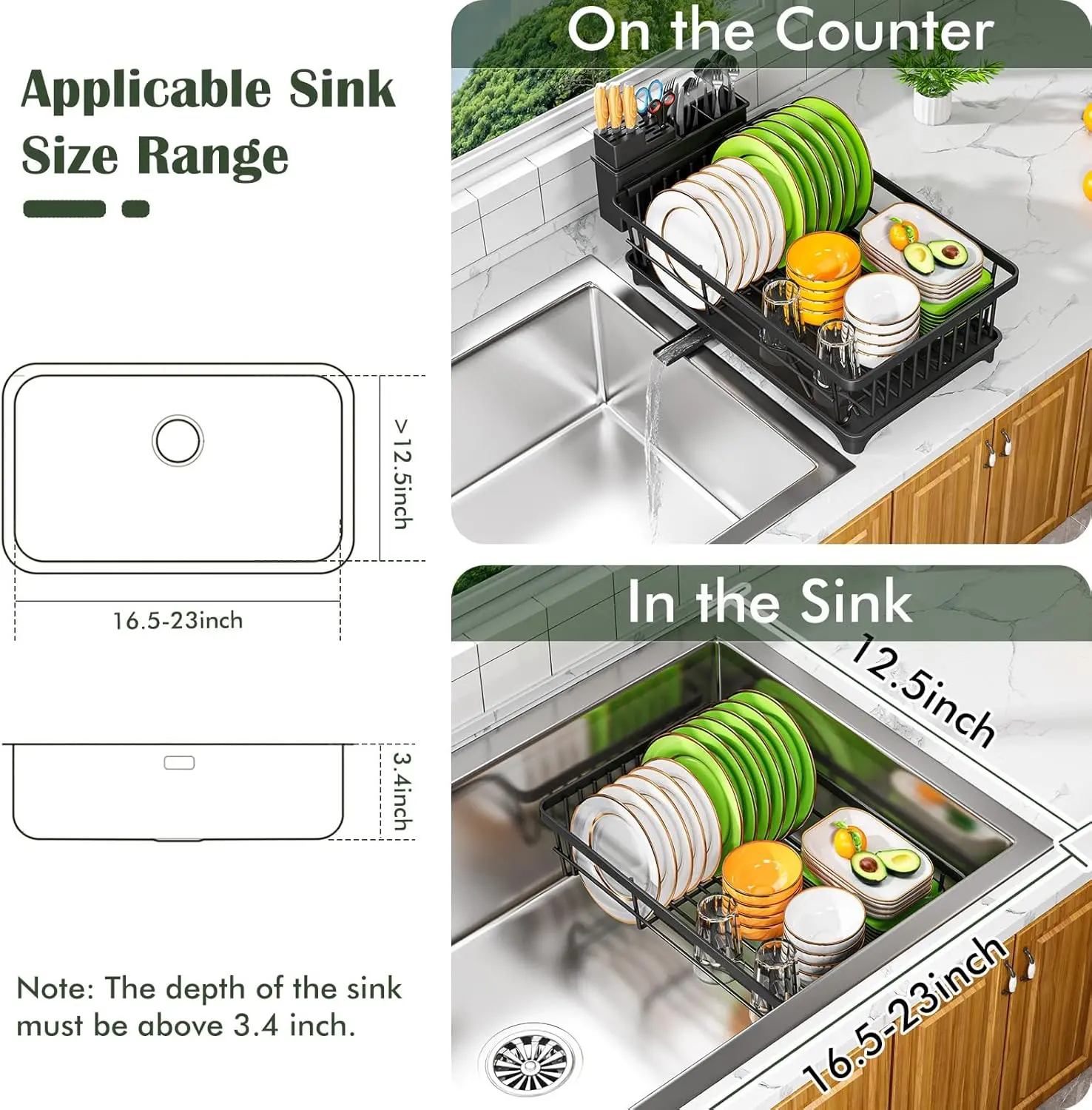 ·Rapid-Drain System: This dish drainer features an angled drip tray and a draining spout that channels water directly into the sink. No more puddles or soggy counters—enjoy faster drying and a cleaner workspace. Easy to store, small in size. Tips: Water may not drain smoothly if the sink edge is above the counter.