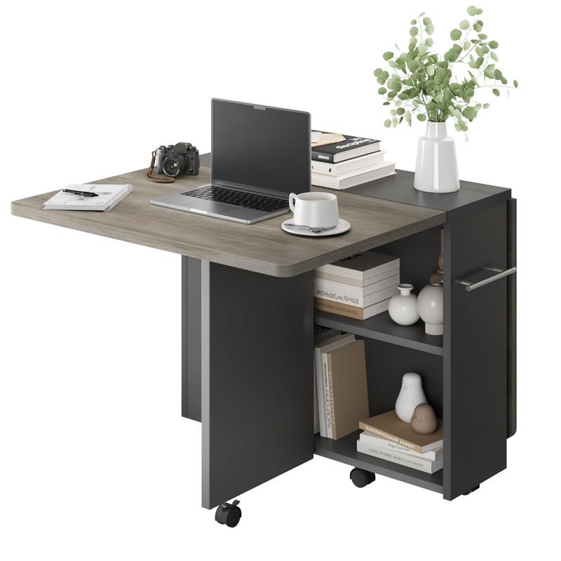 Easily transform it into an office desk by folding one side of the tabletop, creating ample space for your computer and books. The 2-layer storage shelf keeps your space organized, while the 15mm thick tabletop supports up to 150 pounds without wobbling. The pin control allows for easy folding and extension, making this table a functional and space-saving solution!