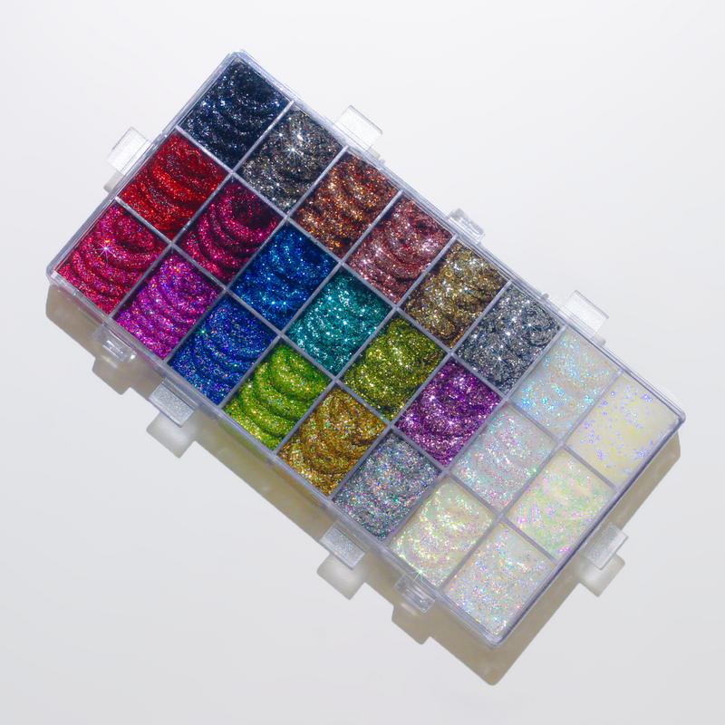 Unveil boundless creativity with the SPACECASE Glitter PRO-Palette Bundle – a stellar collection of 48 professional glitter concentrates, blends and UV activated shades that redefine the art of glitz without the need for messy glue. These portable, airtight cases house every shade of our revolutionary Spacepaste, Spacejam, and Sheer Glowjam. Our medium glides on like a second skin. Bid farewell to the frustration and chaos associated with loose glitter or the messiness of old-school glitter gels – SPACECASE is the unrivaled HOLY GRAIL of Glitter, and it's poised to ignite your creativity.