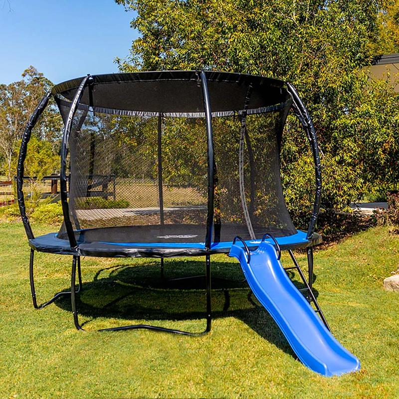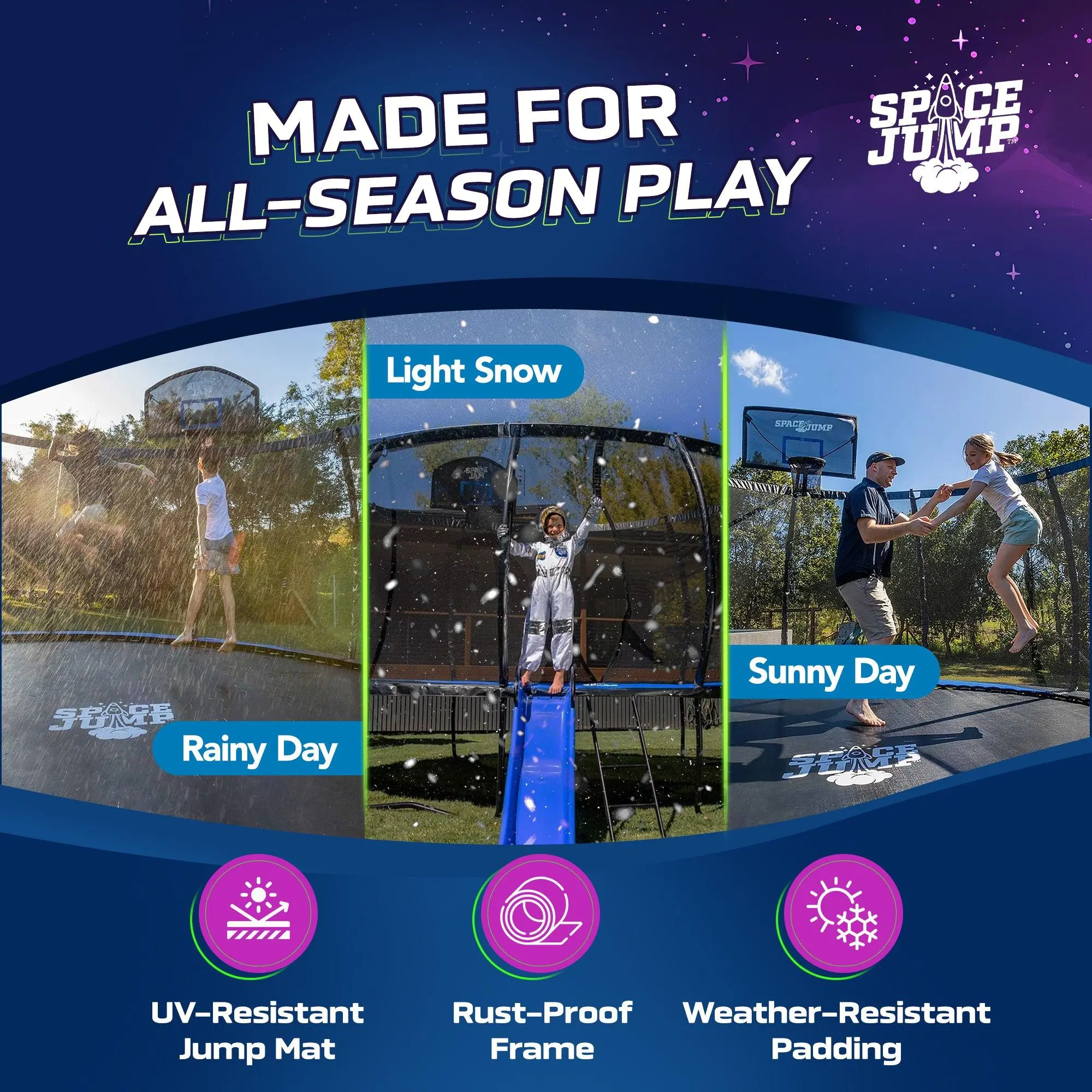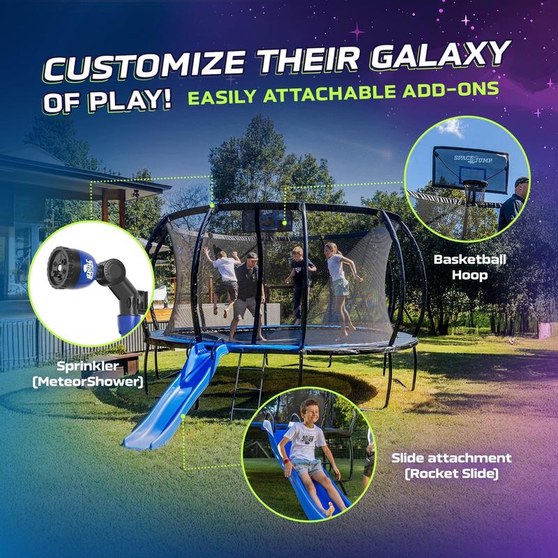 Bring the ultimate fun and safety to your backyard with this high-performance outdoor trampoline, expertly engineered for durability, bounce, and protection. Whether it's for weekend family play or daily active fun, this trampoline is designed to deliver long-lasting performance in every season.The trampoline features robust ThrusterSprings, specially crafted to deliver a consistent and deep bounce, giving kids and adults the thrill they seek with every jump. These springs are built to maintain their tension over time, ensuring endless hours of safe, energetic fun. Constructed with galvanized steel and a robust zinc coating, the frame is built to resist rust and wear, offering strength you can trust. The heavy-duty top rail and leg frame system provides a stable and secure base, reinforcing the entire structure for dependable use over time, even during vigorous activity.A protective edge pad completely covers the springs and any frame gaps, shielding jumpers from direct contact with metal components. This layer of safety helps reduce the risk of injury, making it a perfect choice for families with children. Designed to endure the elements, the trampoline is UV-resistant and weather-tough, so it can handle long sunny days and varying weather conditions without fading or breaking down.Surrounding the jump area is a tightly woven 360-degree infinity net, crafted from strong yet soft materials. This enclosure offers an added layer of safety and peace of mind by preventing accidental falls while maintaining clear sightlines and airflow. When you choose SpaceJump, you're not just getting a trampoline, you're joining the SpaceJump flight crew. That means we're here for you, for the long haul.