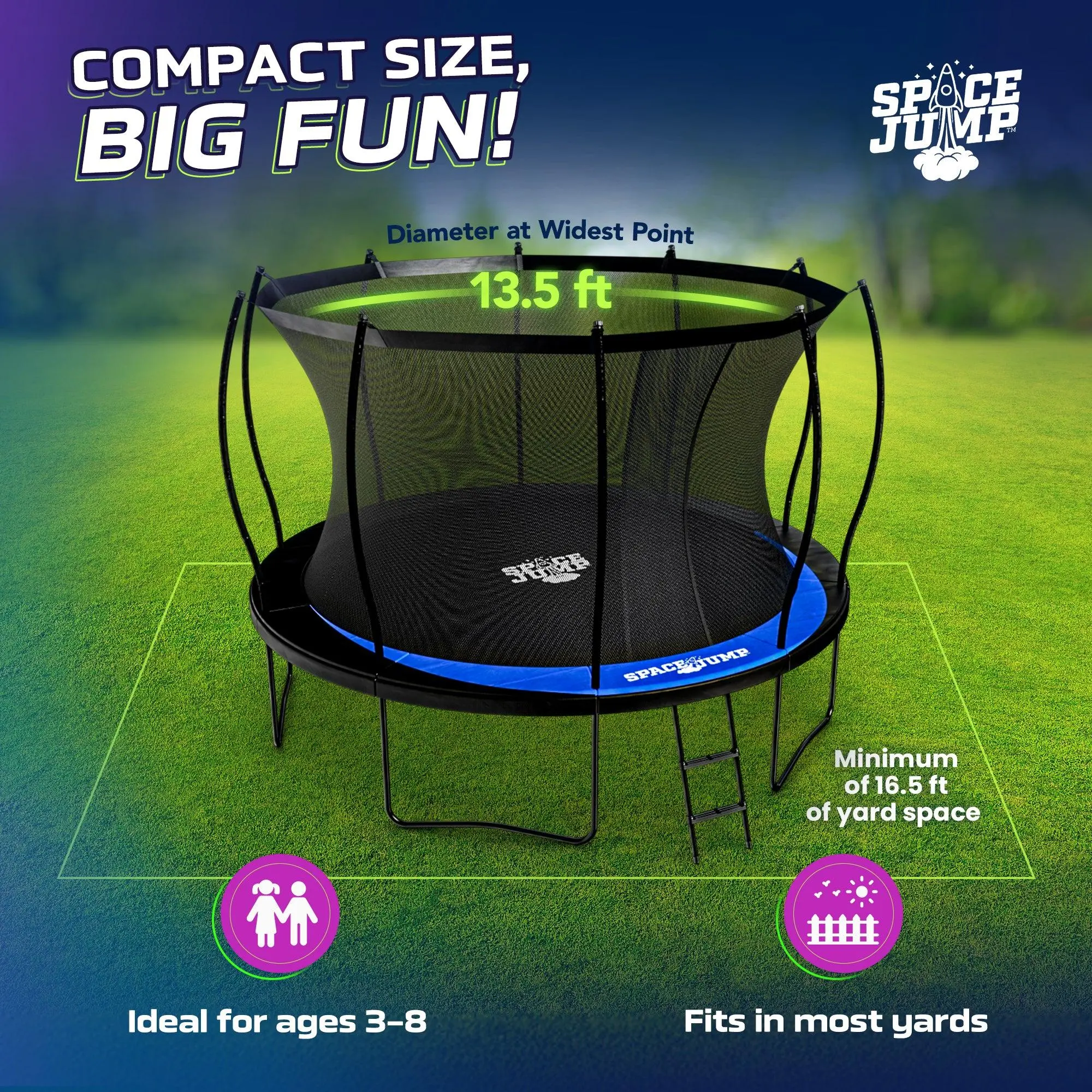 Yard Space: 13.5-feet diameter at the widest point with 3 feet of recommended free space around the trampoline