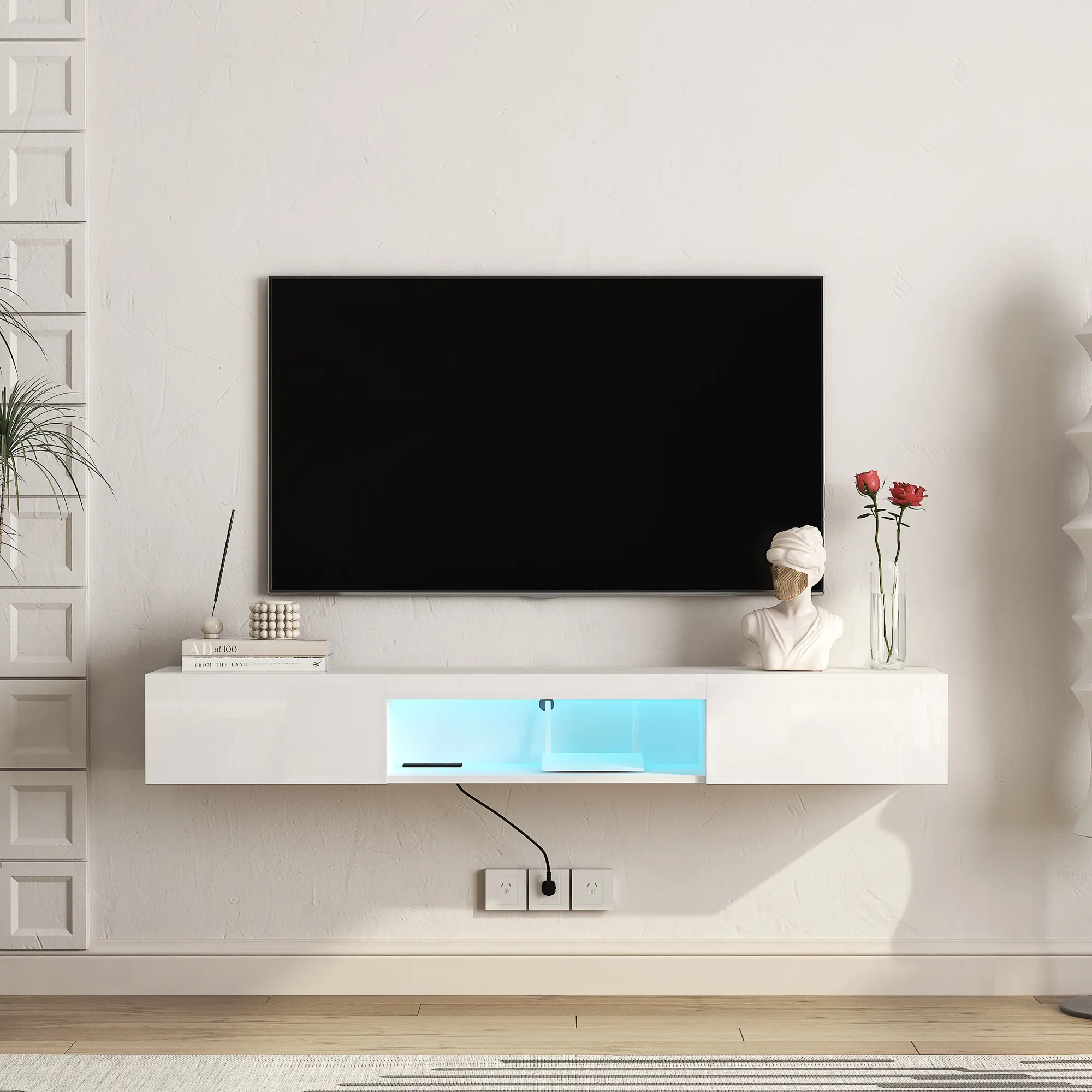 【Spacious Storage】 This wall-mounted floating TV stand offers ample space for TV components, game accessories, books, decorations, and more—ideal for organizing living room essentials.