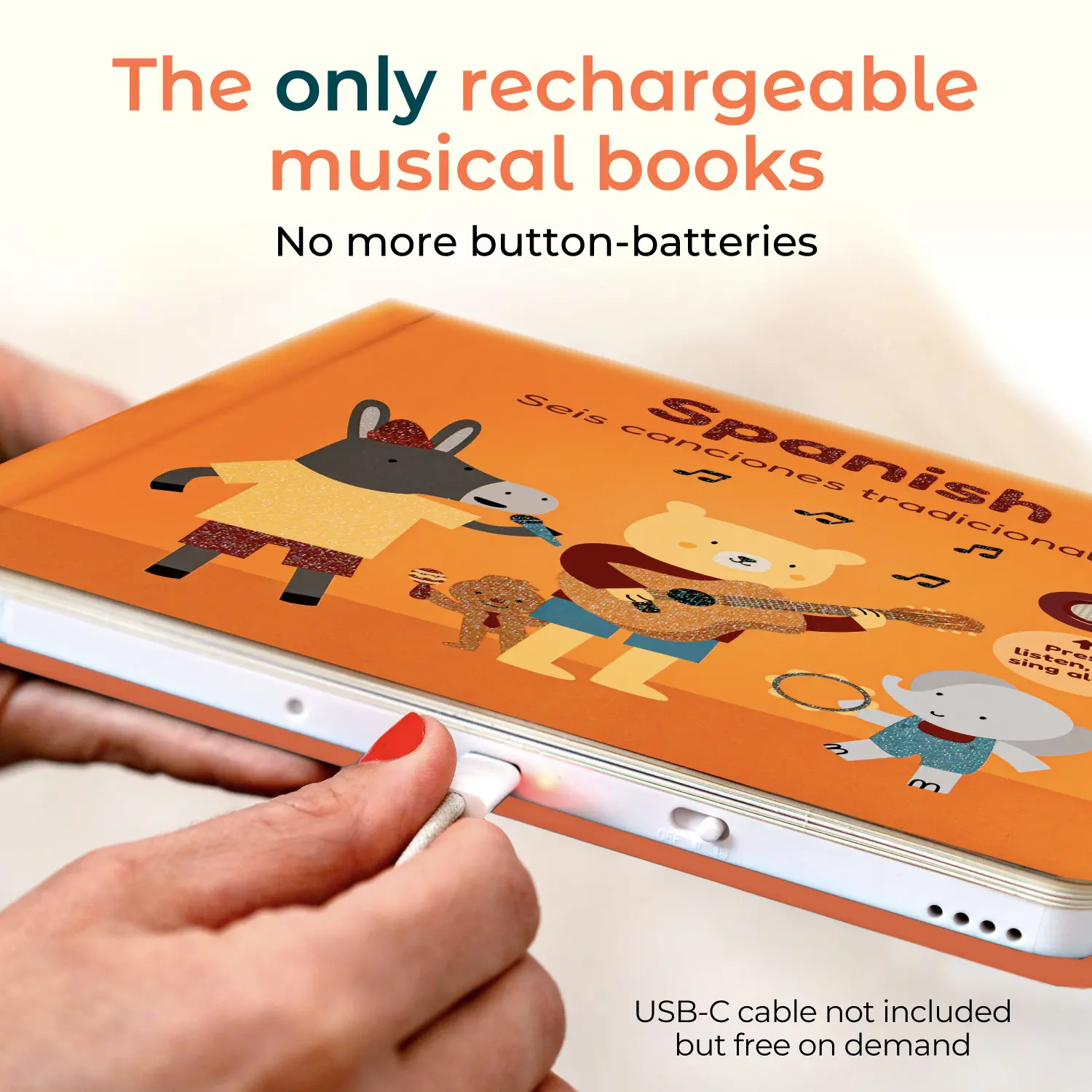 What’s in the box? The beautifully illustrated sound book with six pages of songs, built-in sound buttons, and a rechargeable battery ready to spark joy and learning.