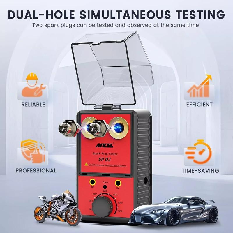 ANCEL SP02 car spark plug tester is for testing the performance and endurance of spark plugs. The product simulates real engine conditions and runs up to 6,000 rpm. It is compatible with all spark plug tests for crankshaft and motorcycle engines on the market. It can also test two holes at the same time and is designed with a protective cover to ensure safe operation for maintenance personnel during testing.