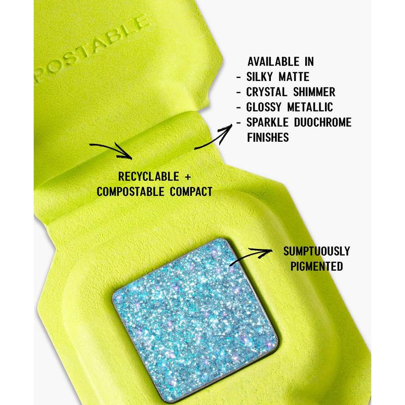 Sumptuously pigmented eyeshadows, each tucked away in a pocket-sized, first-of-its-kind, compostable compact. Mix and match colors and finishes to create a beauty colorscape that is uniquely you. Available in four striking finishes: Silky Matte: creamy, high-pigment payoff Glossy Metallic: buttery, foiled, one-swipe color Crystal Shimmer: a fairy-like twinkle Sparkle Duochrome: color-shifitng sparkle