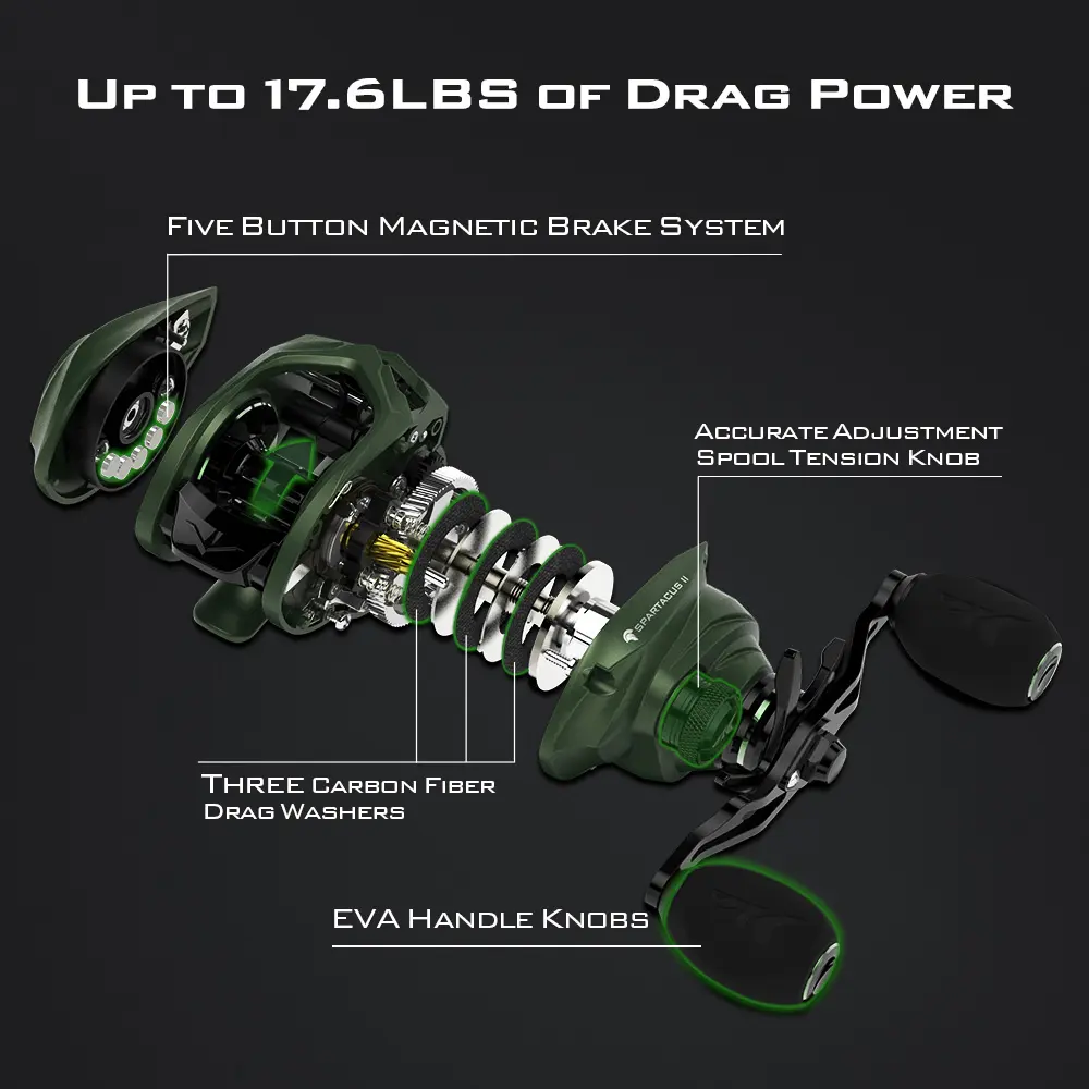 ·Refined Casting Reel – The KastKing Spartacus II casting reel is built for ultra-smooth casting and retrieval with its 7+1 MaxiDur bearing system. With 17.6 pounds max drag, it handles big catches with ease, while the 7.2:1 gear ratio provides faster line retrieval. Constructed with aerospace aluminum main gears and brass pinion gears, making the KastKing fishing rod and reel combo an excellent choice for anglers in all fishing conditions.