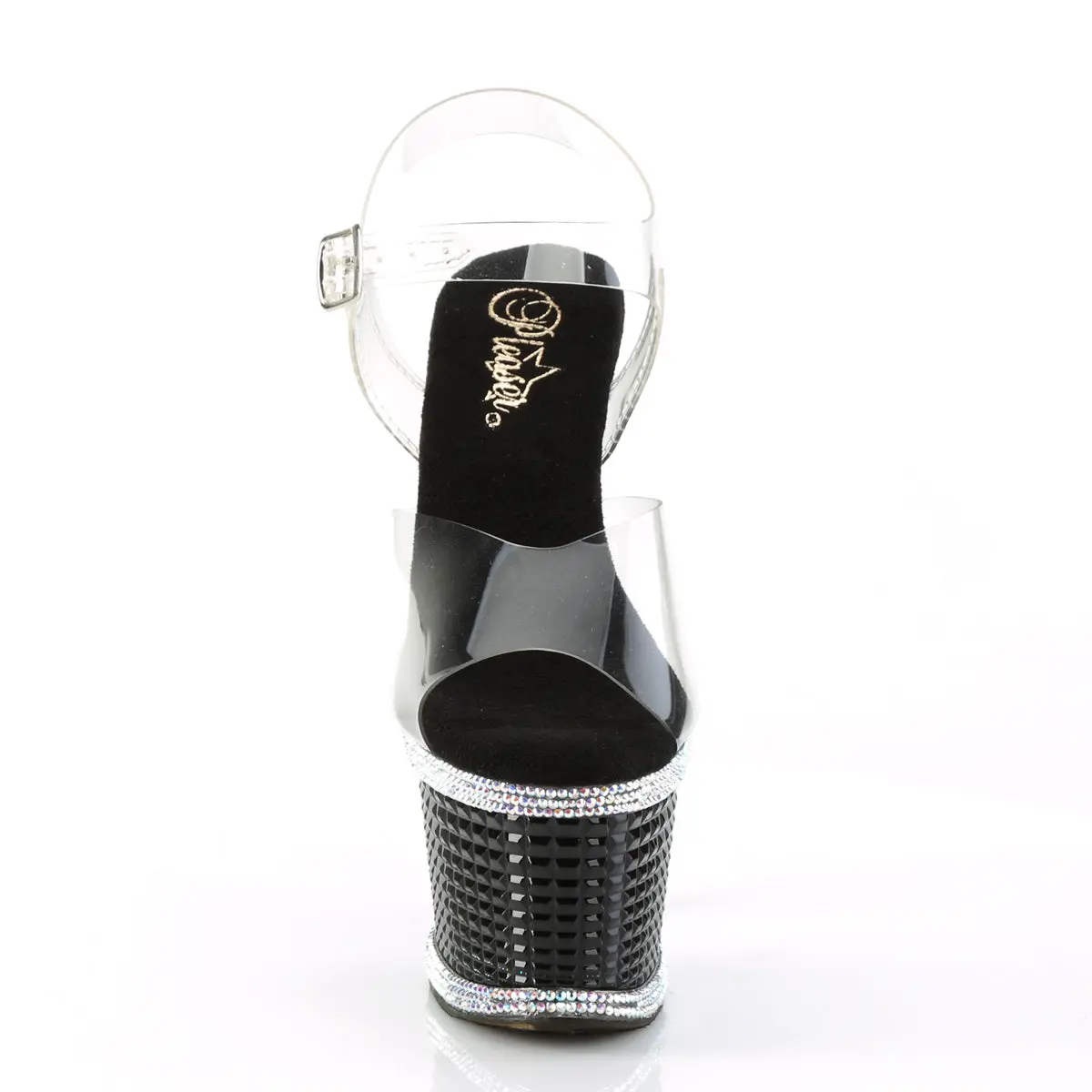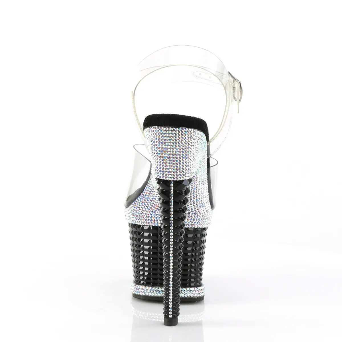 Introducing the Spectator-708RS Sandals, a masterpiece of glamour and style. Boasting a 7" heel and a 3" textured platform, these sandals are embellished with shimmering multi-colored rhinestones, offering an eye-catching detail that sparkles from every angle. The clear and black design creates a sophisticated yet bold look ideal for any evening event or performance. Stand tall and dazzle the audience with these exquisite sandals that are sure to make a lasting impression.