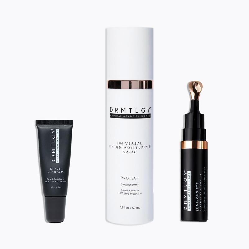 The perfect duo for a natural and effortless ‘no-makeup’ makeup look. Universal Tinted Moisturizer SPF 46, a lightweight, sheer-coverage sunscreen creates a glowing complexion while shielding your skin from harmful UV rays. Luminous Eye Corrector SPF 41 is designed to brighten and color–correct dark circles, leaving eyes refreshed and illuminated. SPF 25 Lip Balm nourishes your lips while providing sun protection.