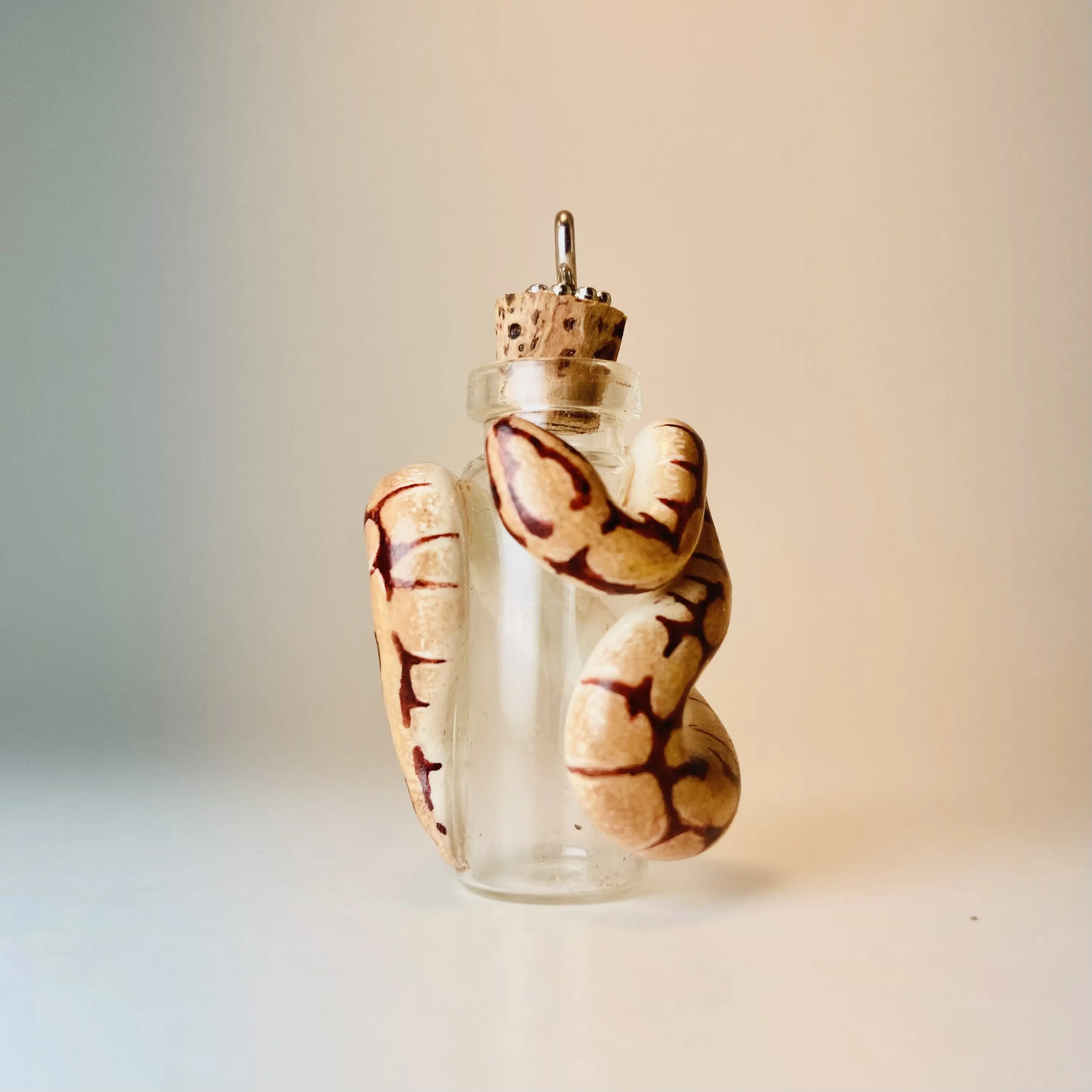 Coiled snugly around the vial is a spider ball python, sculpted from polymer clay and detailed by hand to capture the morphs unique look. Each one is made to order, so yours will be just a little different and special in its own way.