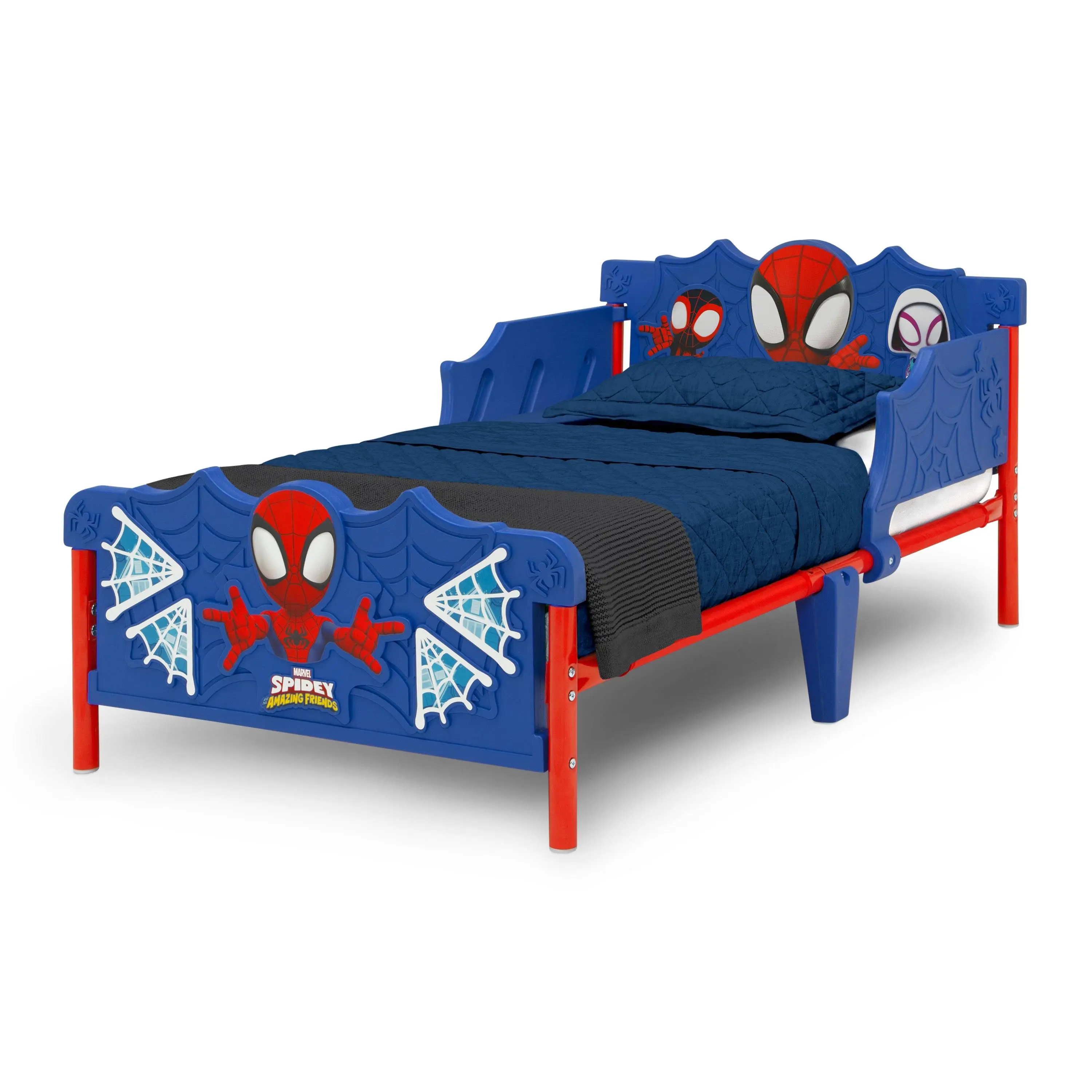 Help your little superhero drift off to dreamland after a hard-day's crime-fighting, swinging and web-slinging with this Spidey and His Amazing Friends 3D Toddler Bed by Delta Children. Featuring colorful Spidey decals, plus three-dimensional accents on the headboard, footboard and side rails, this toddler bed will be the centerpiece of any kid’s bedroom. For additional security, this toddler bed is the perfect kid-sized height and has two attached guardrails, which makes it the best option for your child’s first big-kid bed. It provides the independence your growing child craves while keeping them safe throughout the night. The Spidey and His Amazing Friends 3D Toddler Bed by Delta Children is sure to inspire big dreams for your little one.