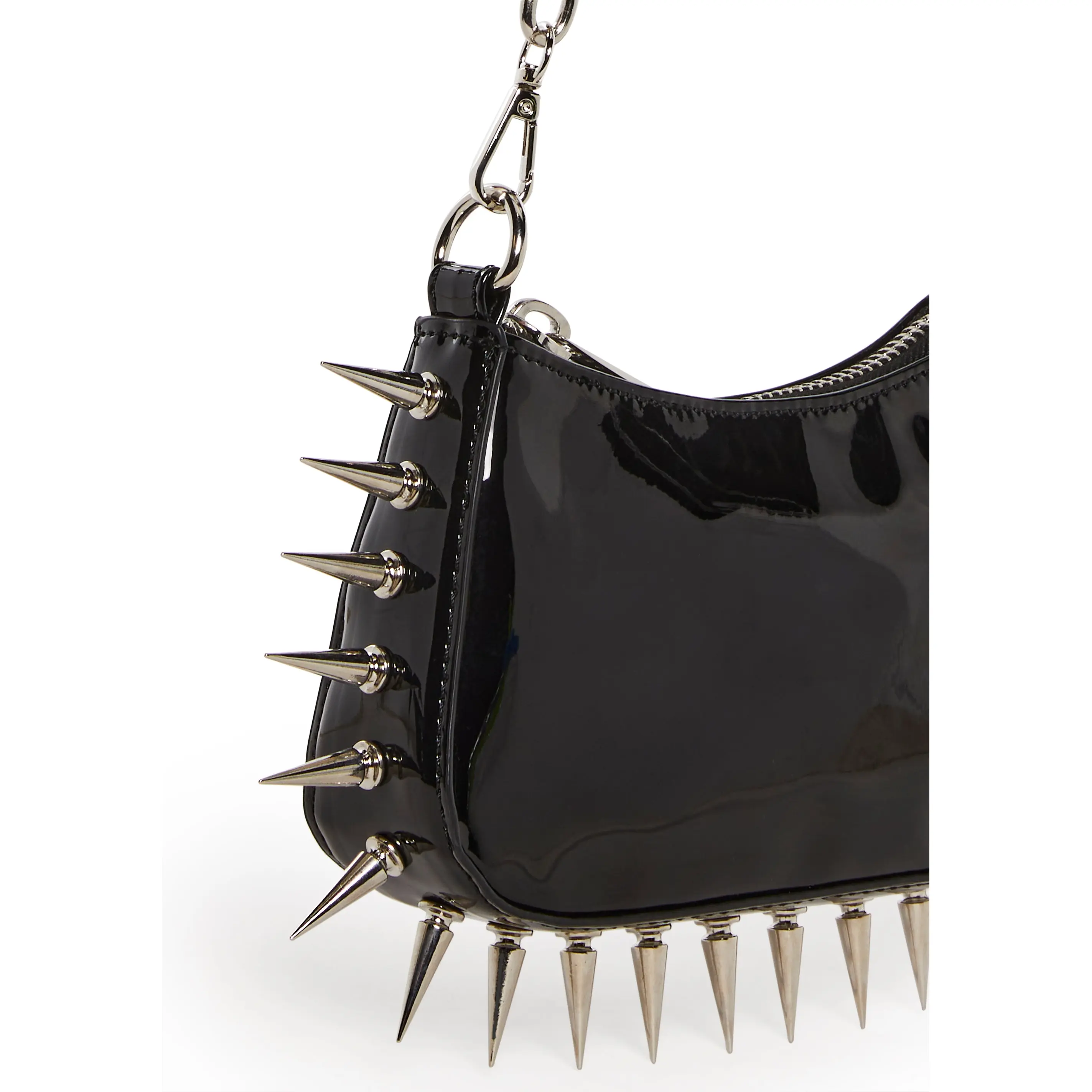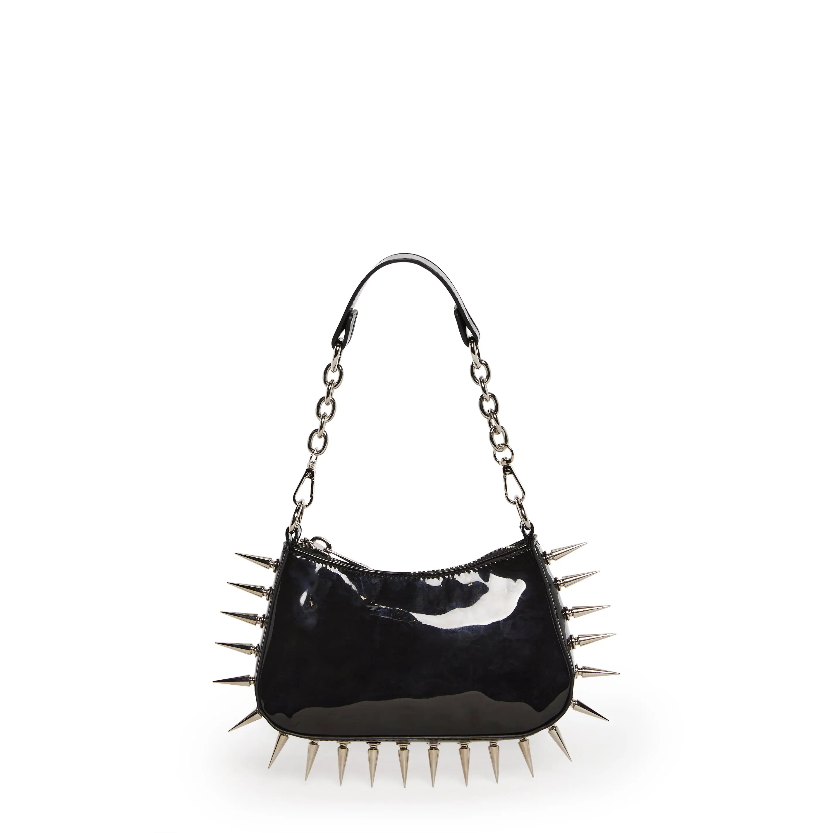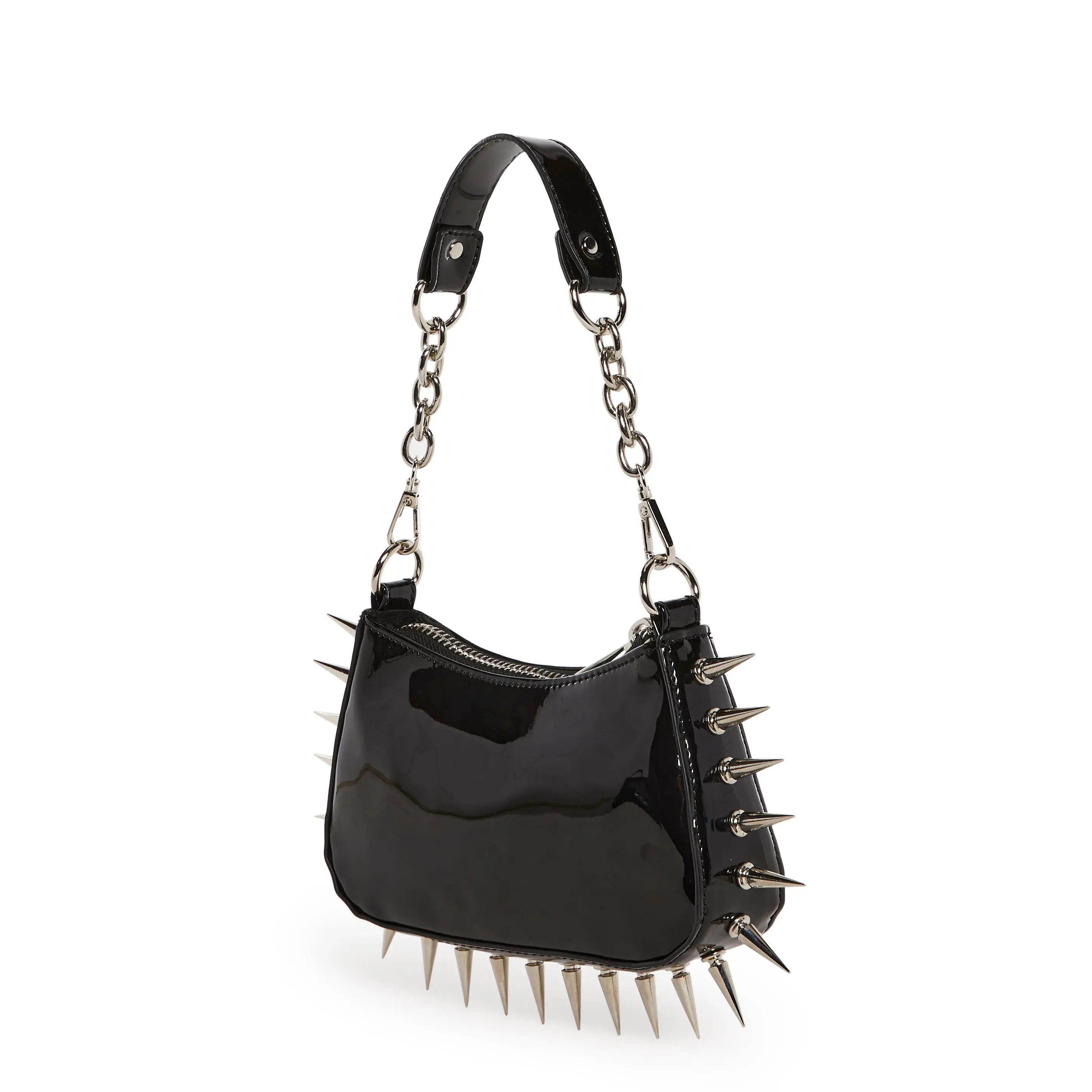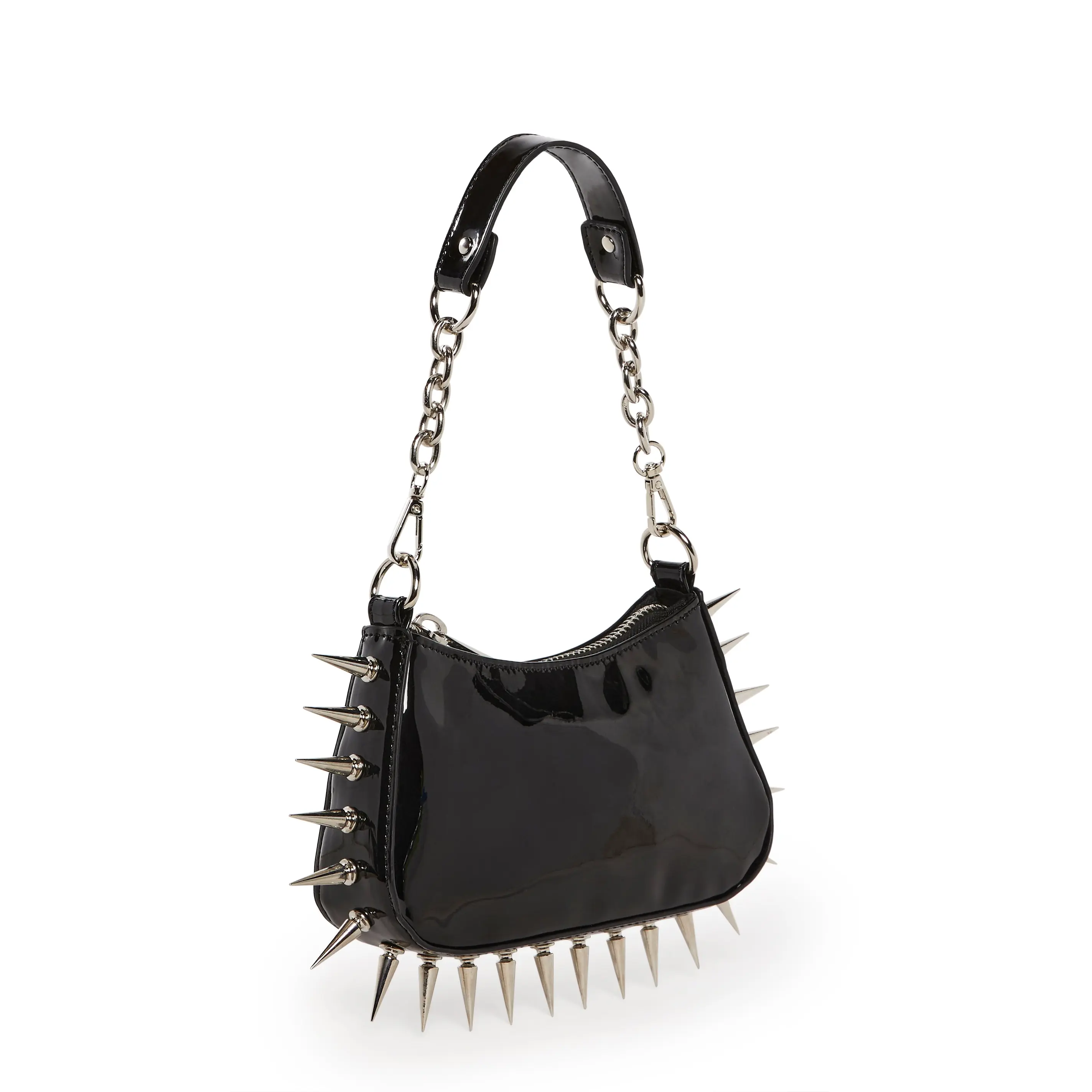 No one will mess with you with this shoulder bag that has a patent vinyl vegan leather construction, spiked detailing, a chain link shoulder strap, and a top zipper closure.