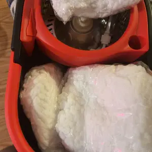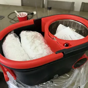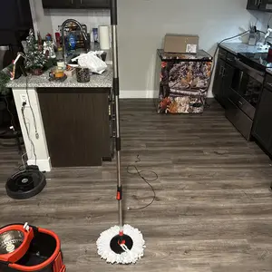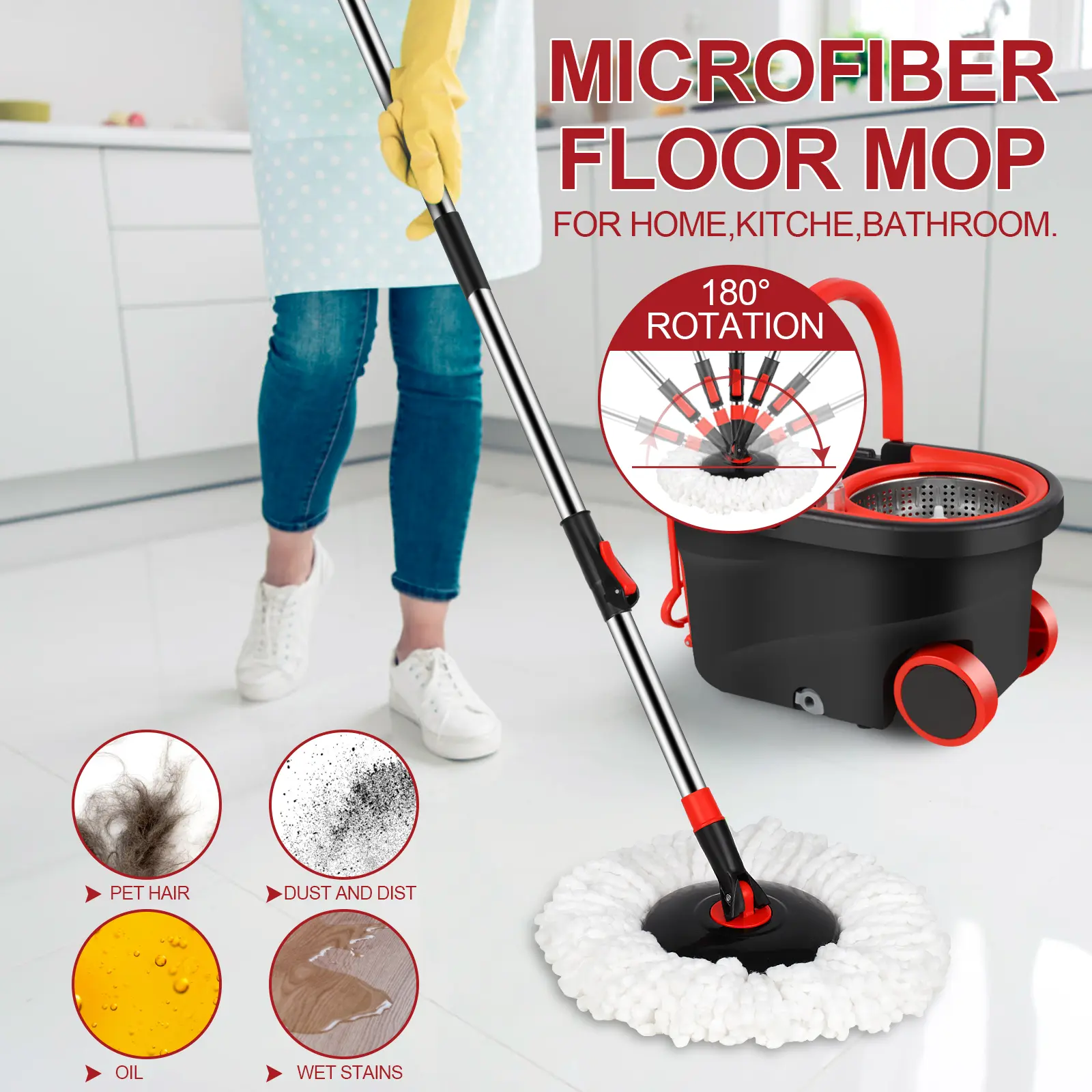 Our spin mop and bucket set cleans all floor surfaces, including laminate, hardwood, tile, and marble. It effectively removes stains like spilled soda, coffee grinds, ketchup, and pet hair in one pass. Perfect for daily household cleaning. 🏠