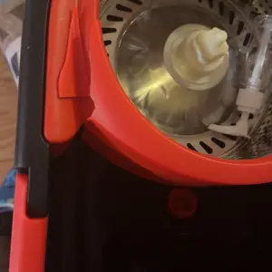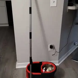 The mop rod telescopes from 38 inches to 61 inches. The buckle on the rod matches the wringer in the bucket, allowing for free rotation. A sturdy hook at the top allows you to hang the mop when not in use. 📏