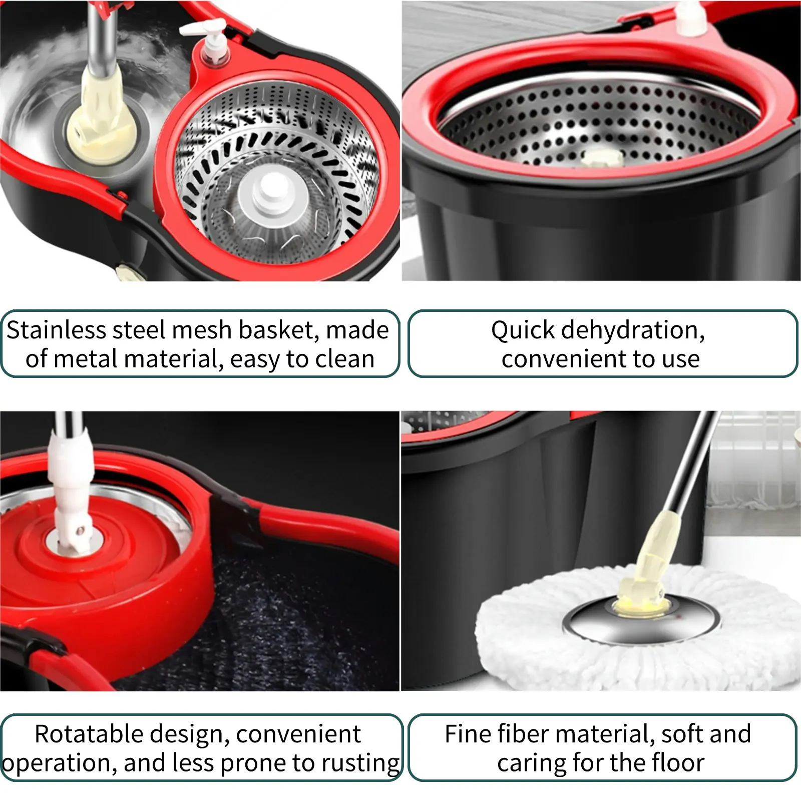 Exquisite Design: The mop bar is locked and stretched to prevent slipping. Stainless steel dewatering basket with vortex wheel design is not easy to splash during dewatering. Portable handle that can be operated by all ages without the need for effort.You can rotate the mop head 360 ° to clean corners effortlessly
