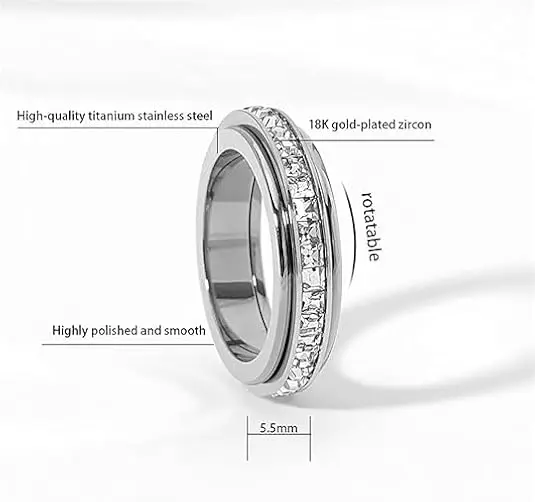 Premium Quality: Crafted from titanium steel and cubic zirconia, this anxiety ring is lightweight, durable, hypoallergenic, and comfortable to wear. Smooth edges ensure no irritation, available in sizes 5–9.