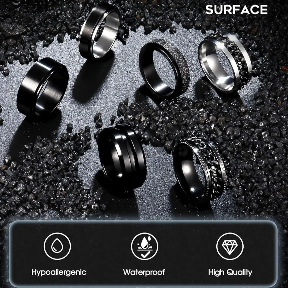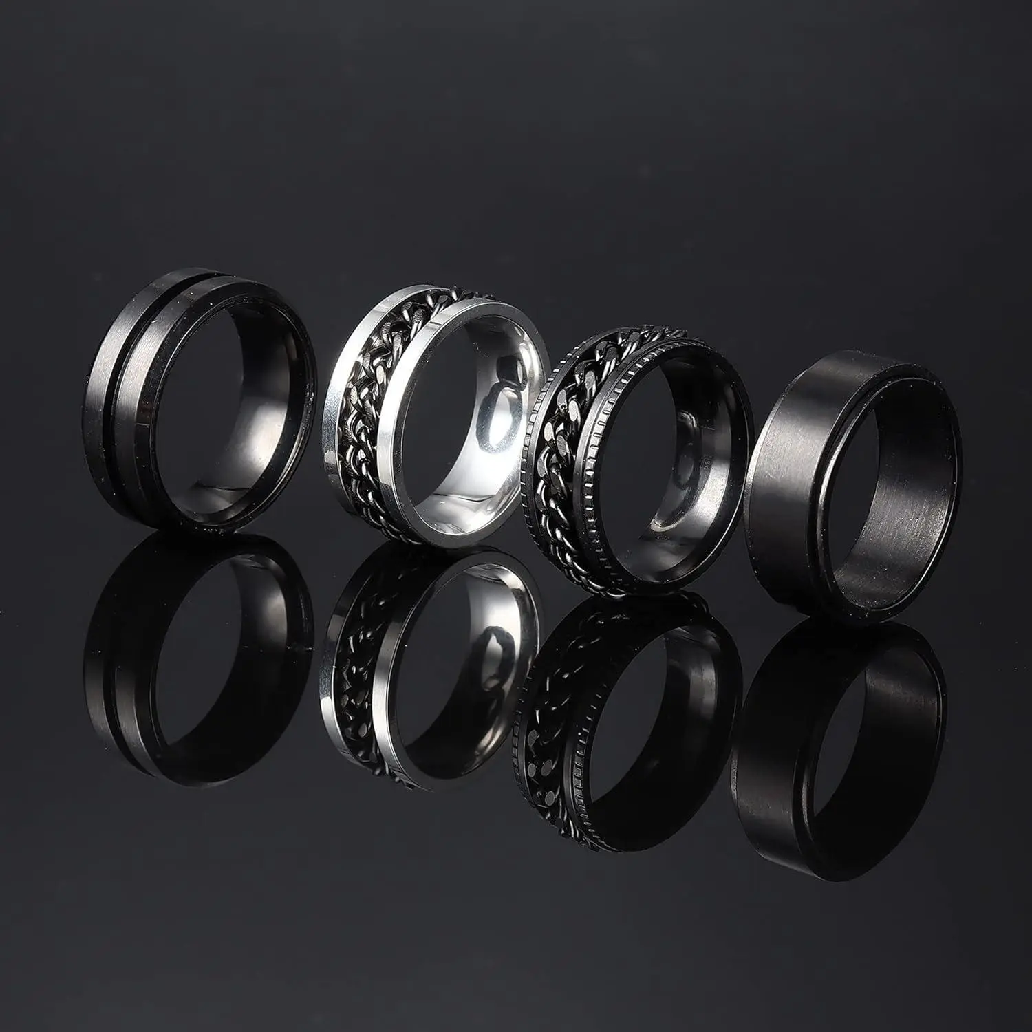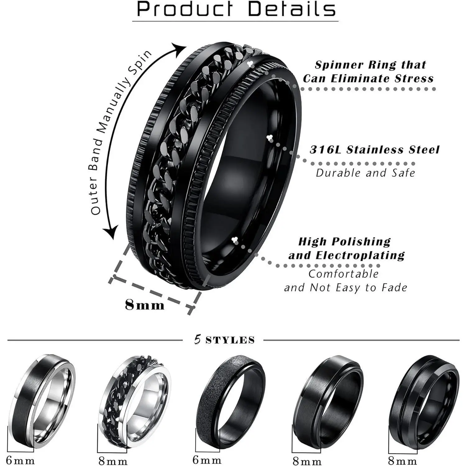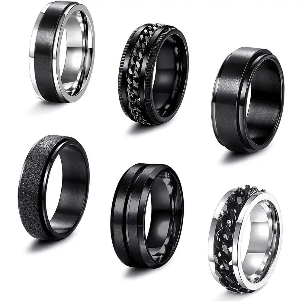 This set includes 6 spinner rings made of stainless steel. These rings ensure durability and long-lasting use. Perfect for both men and women, they offer a stylish and functional accessory.