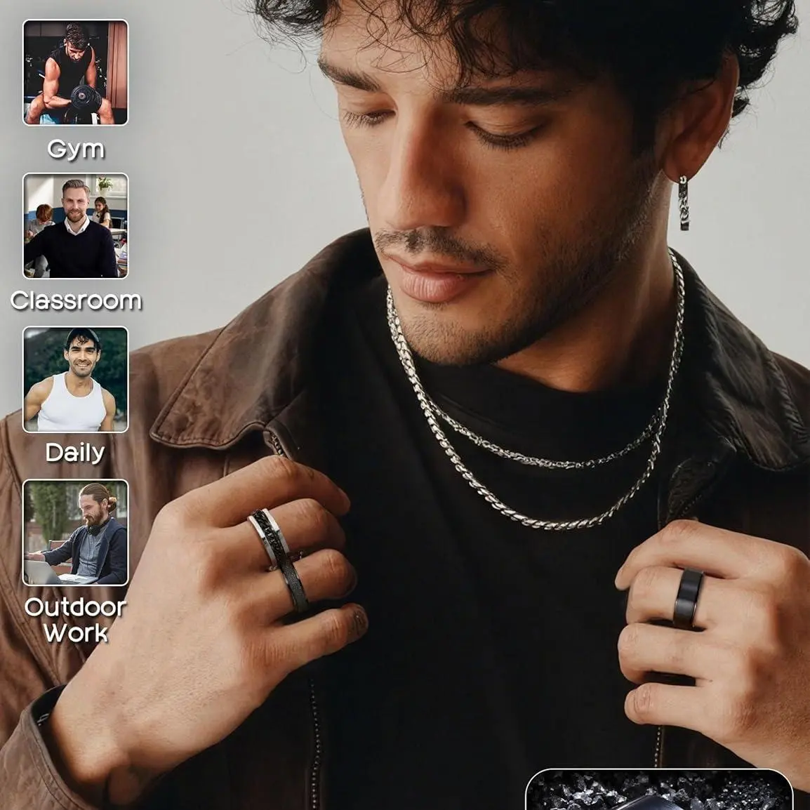 The rings feature a sleek black color and a unique cool chain design. This adds a fashionable touch to any outfit, making them a standout piece.