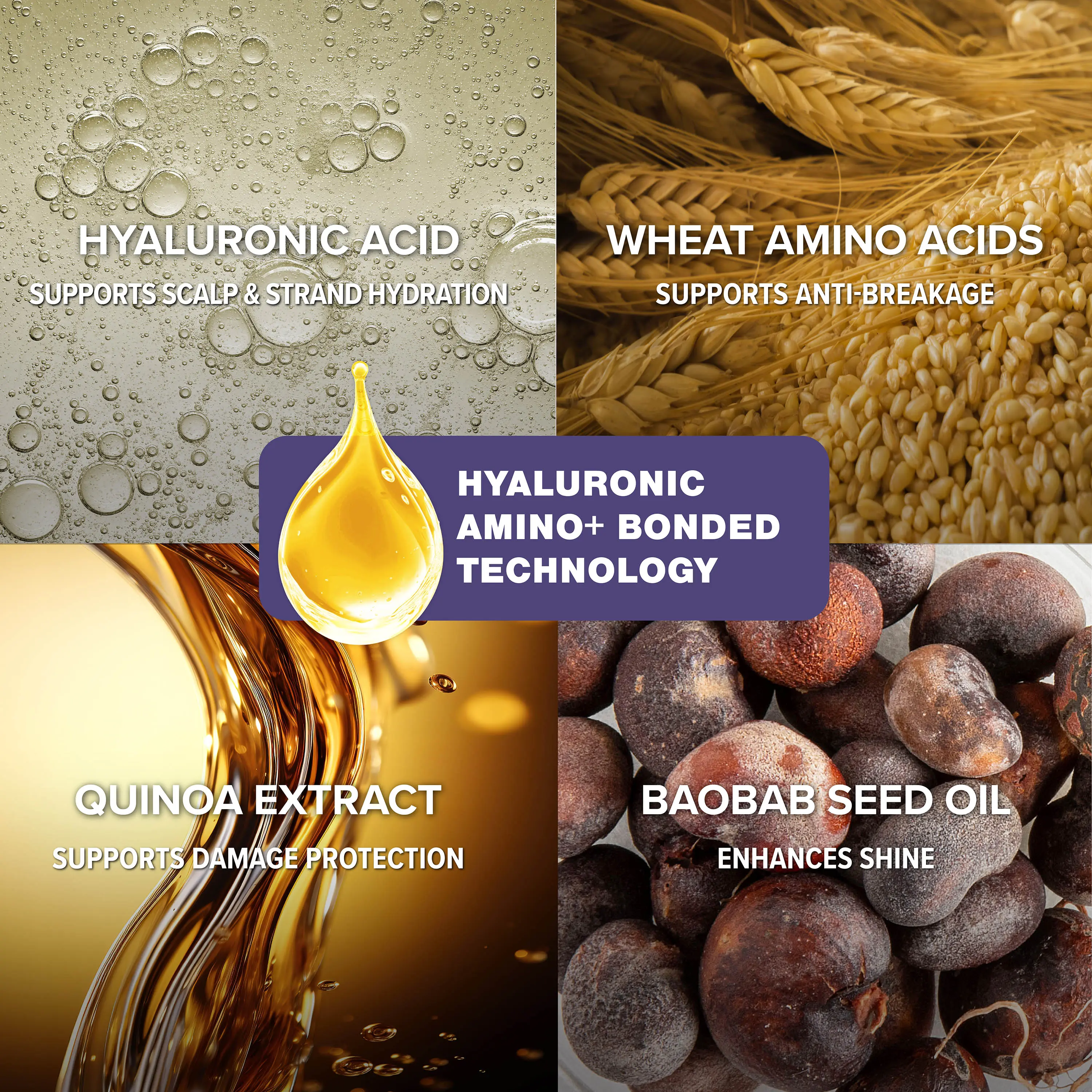 ·Wheat Amino Acids – Help replenish moisture and fortify strands