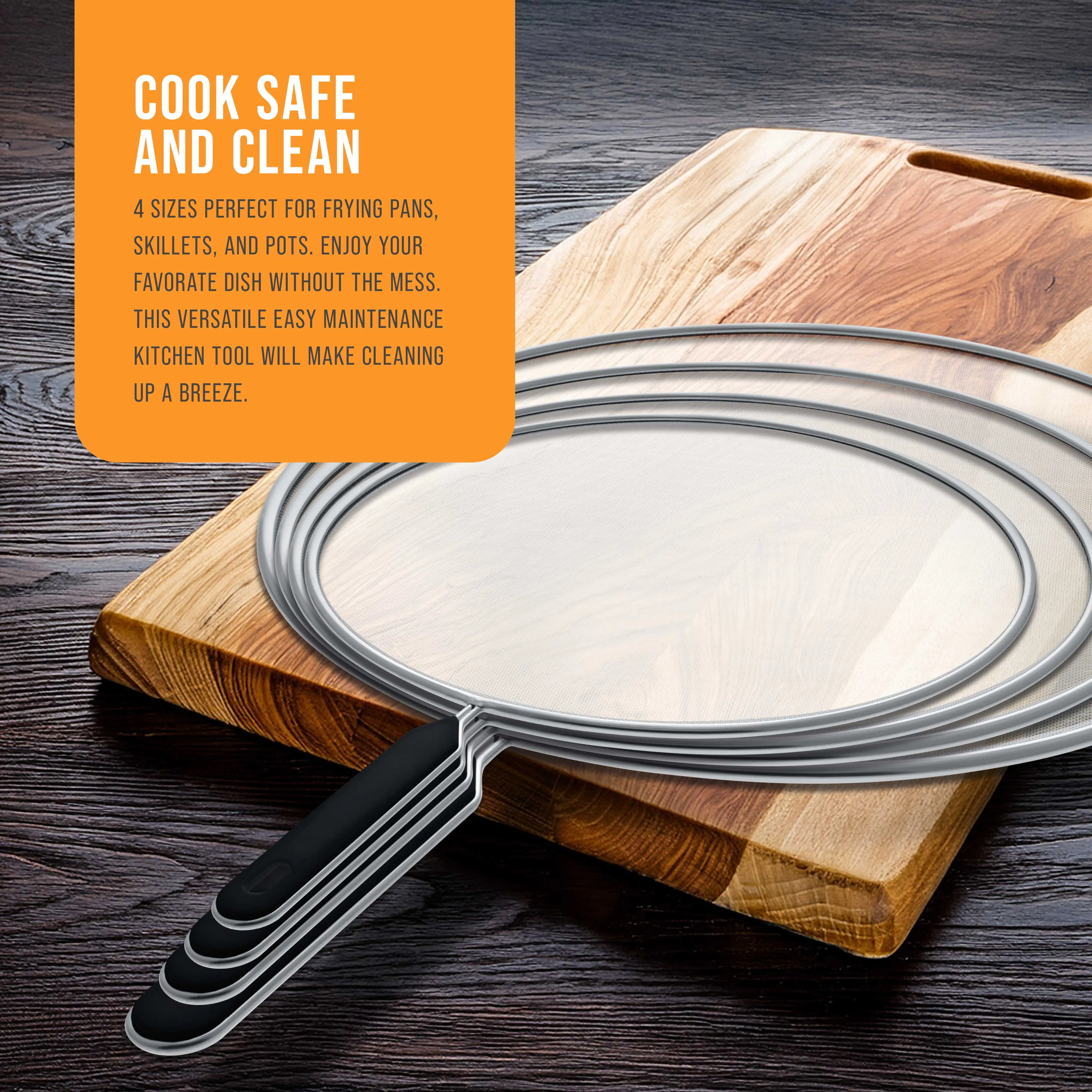 Avoid the unpleasant, messy part of the cooking experience by using our durable splatter screens when cooking in pots and frying pans. With this collection of 4 splatter screen sizes, you'll have the correct screen size available for any size of pot or pan you use!