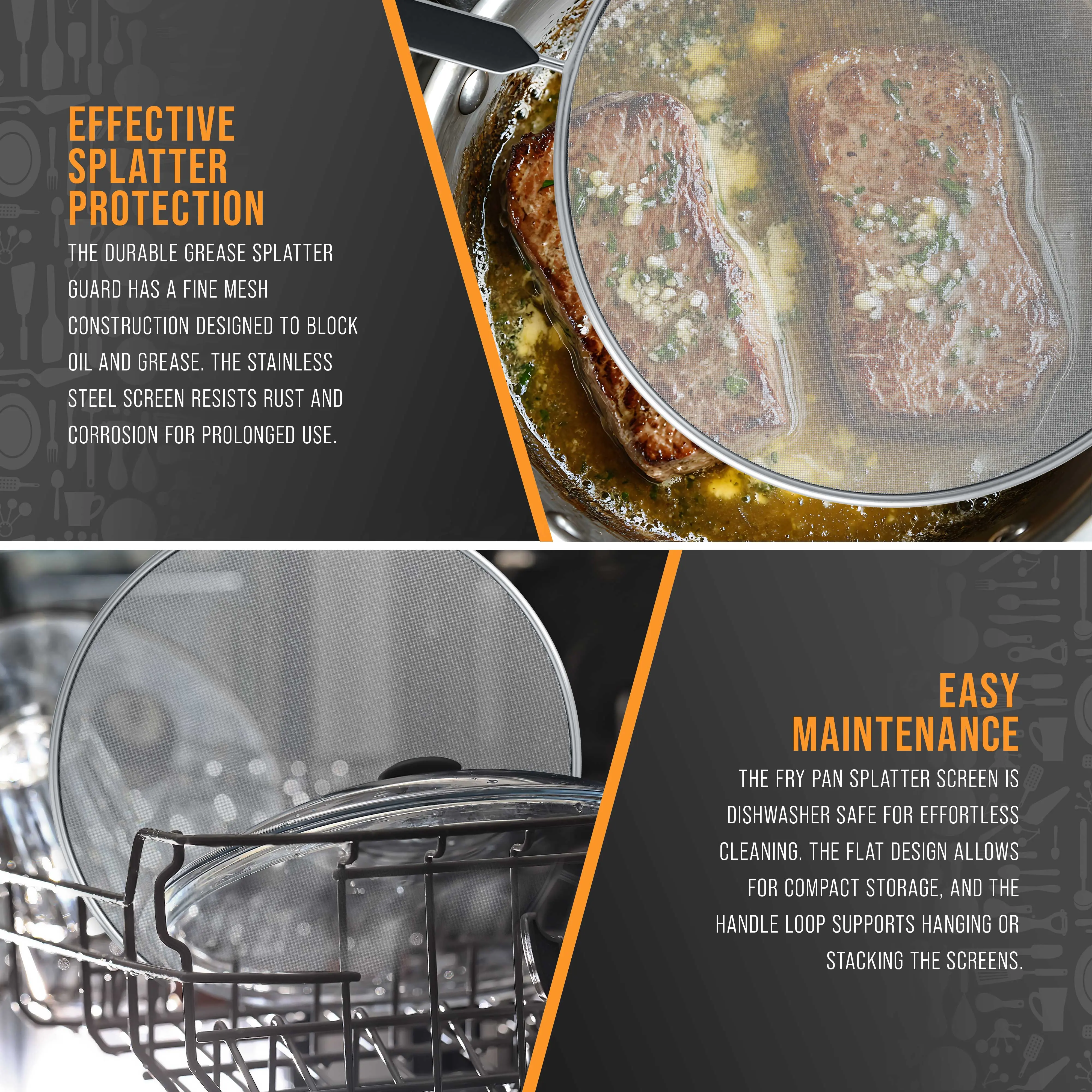 Screens clean easily in a dishwasher or with soap, water, and a dish brush. Their slim profile allows them to be stored between pots and pans.