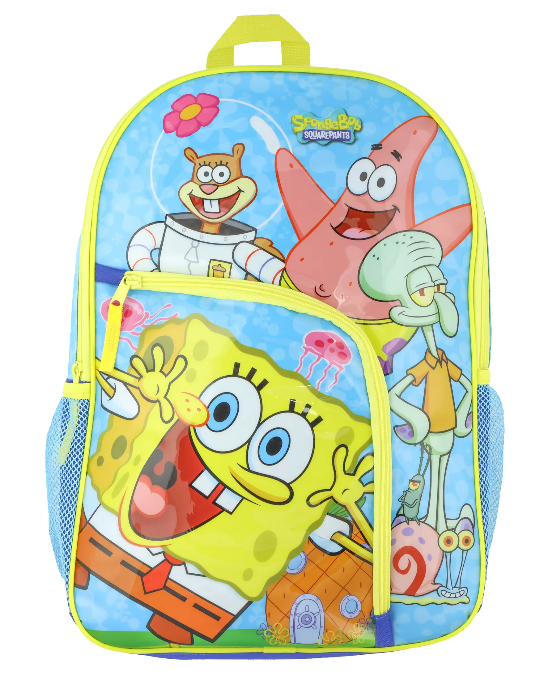 Join the SpongeBob SquarePants fanclub with this backpack. Crafted from nice materials, our backpack is built to withstand the rough and tumble of daily play. It's durable enough to accompany you on all your exciting escapades. The backpack features two pockets on either side, as well as a front pocket for storing all your favorite merchandise! Manufacturer recommended age: 3 years and older. Officially Licensed Product SpongeBob SquarePants Merchandise: This backpack features SpongeBob and several friends! Some of these friends include Patrick, Sandy Cheeks, Squidward, and more! A Design That's Made To Last: The backpack features two pockets on either side, a pocket for storing all your favorite SpongeBob SquarePants merchandise on the front, and a large main pocket on the back! Measurements: This backpack measures approximately 17" x 3" x 13". It is an awesome size for lugging around books, using it as a daily bag, and more! For All Fans: With multiple compartments and pockets, this backpack ensures that you can organize your belongings efficiently. From books and toys to snacks and water bottles, there's a dedicated space for everything. Manufacturer recommended age: 3 years and older