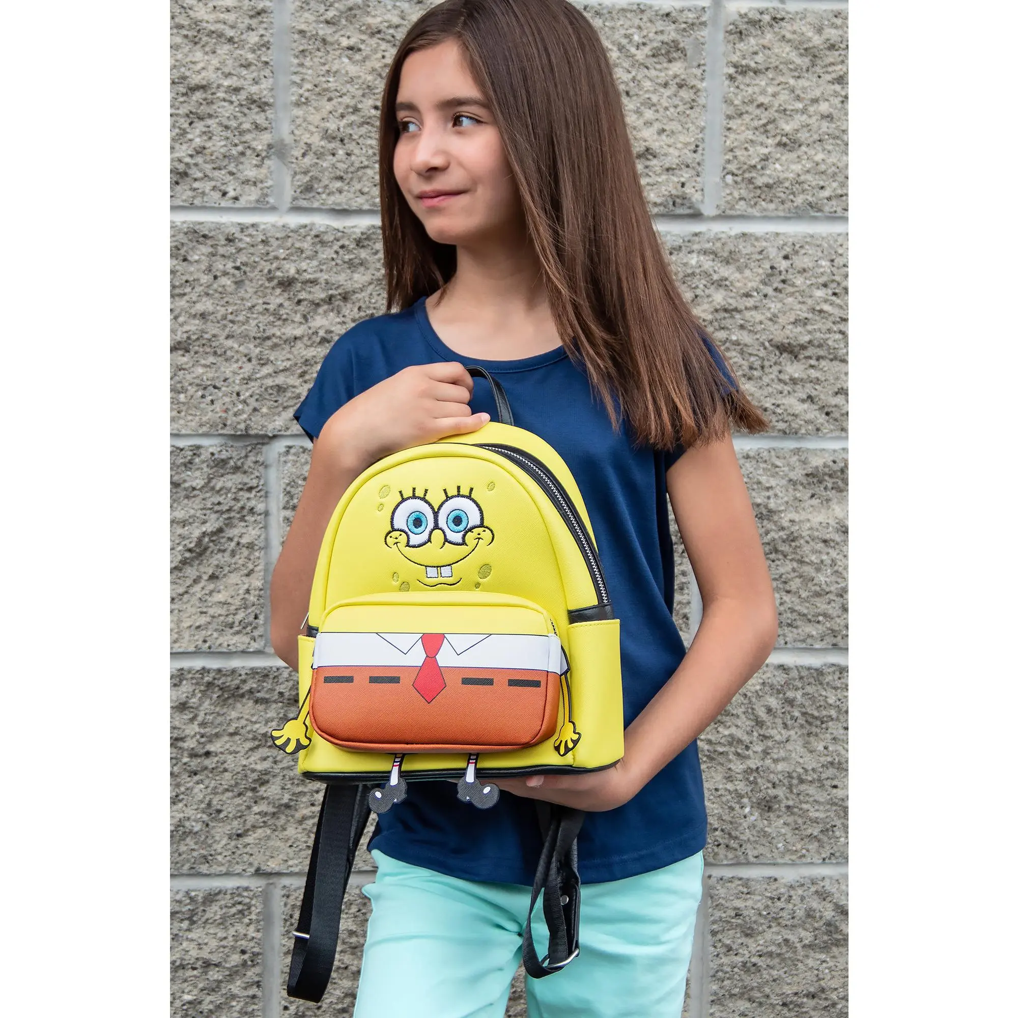 SpongeBob SquarePants is a popular cartoon series that aired on Nickelodeon. This sponge who lives in a pineapple under the sea is known for his passion for making Krabby Patties and his laughable personality. With characters like Patrick Star, Squidward, Sandy Cheeks, Plankton, Mr.Krabs, and Gary the Snail, this series is loved by fans everywhere! This SpongeBob backpack is perfect for any fan. This SpongeBob SquarePants backpack features SpongeBob with hanging arms and legs attached. The front pocket shows off his classic character design of a red tie and bottoms. THIS IS OFFICIALLY LICENSED MERCHANDISE - Intimo is the industry leader in pop culture products and apparel that deal with the entertainment industry in comic books, tv shows, movies, music, sports, and what's trending. DESIGN - This SpongeBob SquarePants backpack features SpongeBob with hanging arms and legs attached. The front pocket shows off his classic character design of a red tie and bottoms. The product has a CSPIA Small Parts Choking Hazard Warning and is for +3 year old individuals only. DESIGN THAT IS MADE TO LAST - The backpack is made of 100% saffiano vegan leather with an enforced and sturdy bottom. It also features a front zippered pocket, an inside zippered pocket, and two water bottle pockets on either side of the backpack. MEASUREMENTS - This backpack measures approximately 10" x 6" x 12". It is the perfect size for lugging around books, using it as a travel bag, and more! PERFECT GIFT FOR ANY OCCASION - Magnificent design for everyday use. This merchandise is designed with true fans in mind. It makes a great gift for Birthdays, Christmas, Valentine's Day, Easter, Father's Day, Mother's Day, or any other special occasion! In fact, it makes a perfect gift for YOURSELF, because you might be the biggest fan of all.