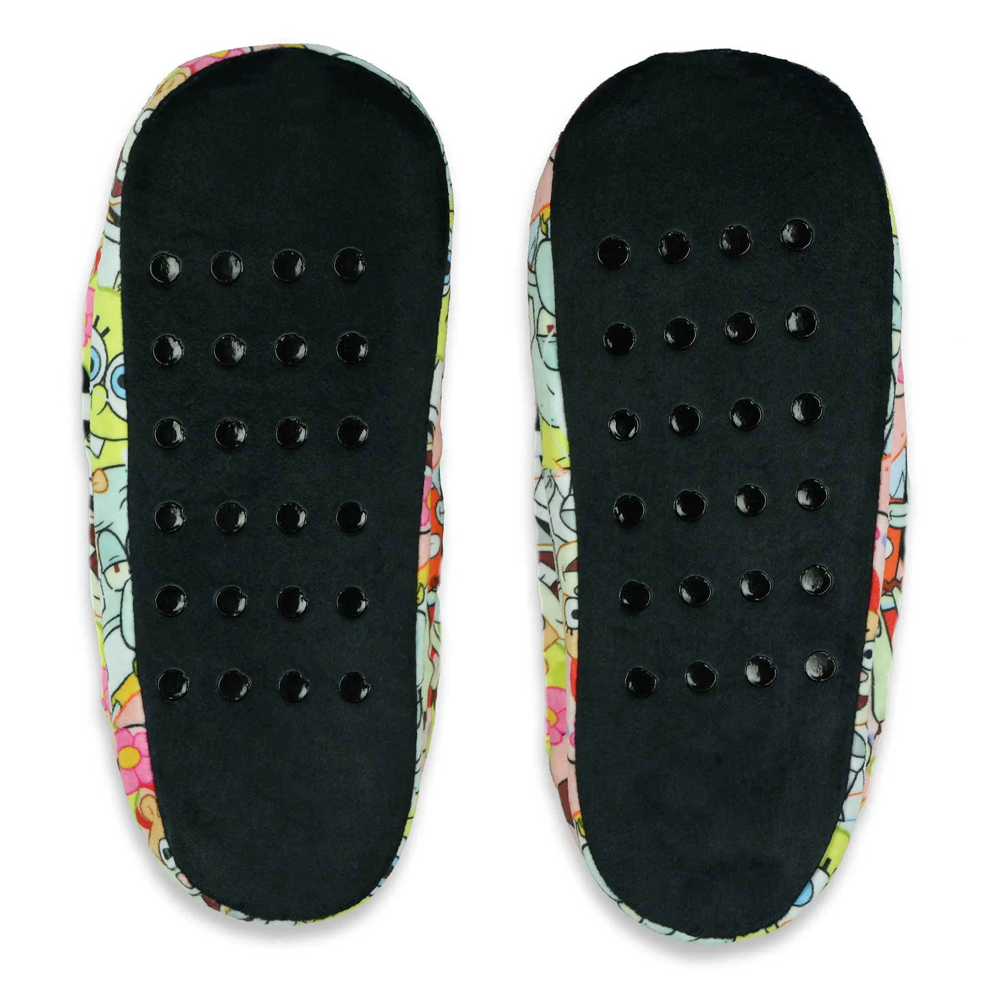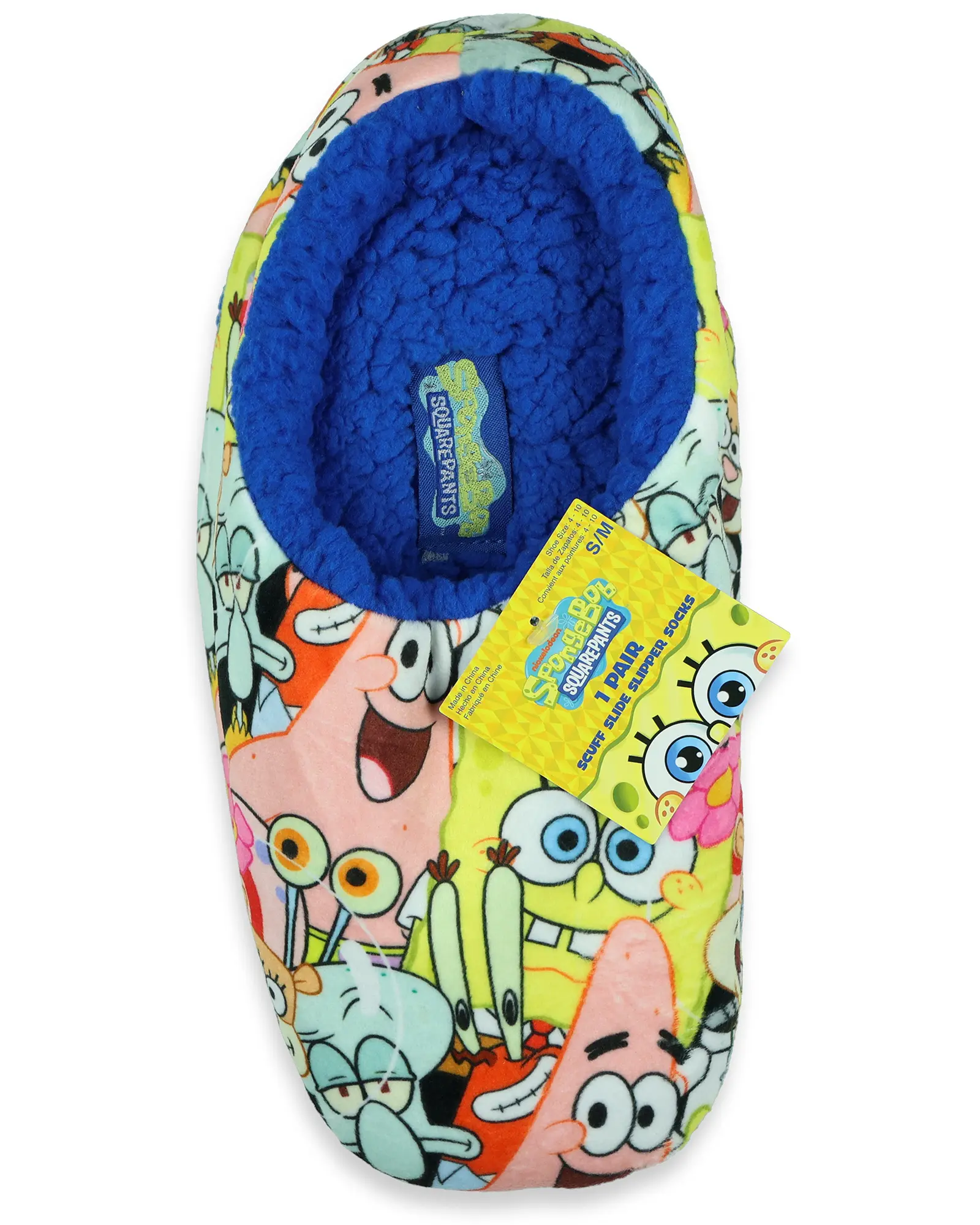 They’re built for easy comfort, with a cushioned half-inch padded footbed and a textured, non-slip sole that gives you steady footing on smooth floors. The open-back slide design makes them effortless to slip on and off, so they’re great for quick errands, relaxing on the couch, or just hanging out around the house. Made from a comfy polyester-spandex blend, they hold up well and fit men’s shoe sizes 4–10 (S/M) and 6–12 (L/XL). When it’s time to freshen them up, just toss them in the wash with cold water and dry on low—easy as that. Bright Allover Character Design: These slipper slides feature a bold, sublimated all-over print of SpongeBob and friends for a fun and eye-catching look. The soft plush fleece interior wraps your feet in cozy warmth, making them ideal for lounging or relaxing after a long day Cushioned Support and Non-Slip Grip: Designed with a ½-inch padded footbed for extra comfort underfoot and a textured, non-slip sole for added traction on smooth floors. The open-back, slip-on design makes them easy to slide on and off whenever you need quick comfort Easygoing Comfort: Whether relaxing on the couch, heading to the mailbox, or grabbing a late-night snack, these slipper socks deliver comfort and convenience. Their flexible design makes them a go-to choice for downtime or casual indoor wear Soft, Durable Construction and Fit: Made from a 97% polyester and 3% spandex blend for a plush yet resilient feel. Available in two size ranges to fit men’s shoe sizes 4–10 (S/M) and 6–12 (L/XL) comfortably Simple Care Instructions: Machine wash cold with like colors and tumble dry low to keep them looking and feeling fresh wear after wear