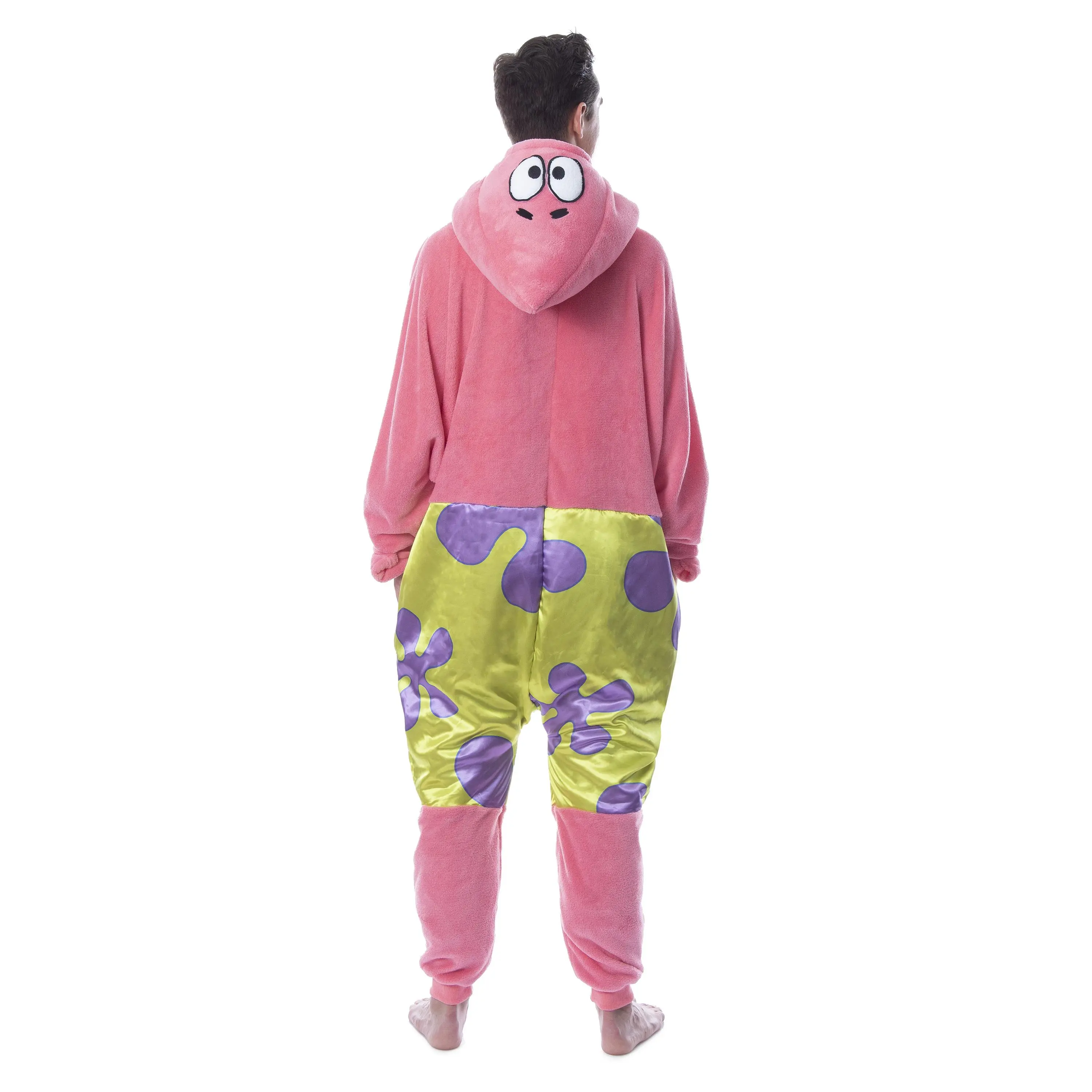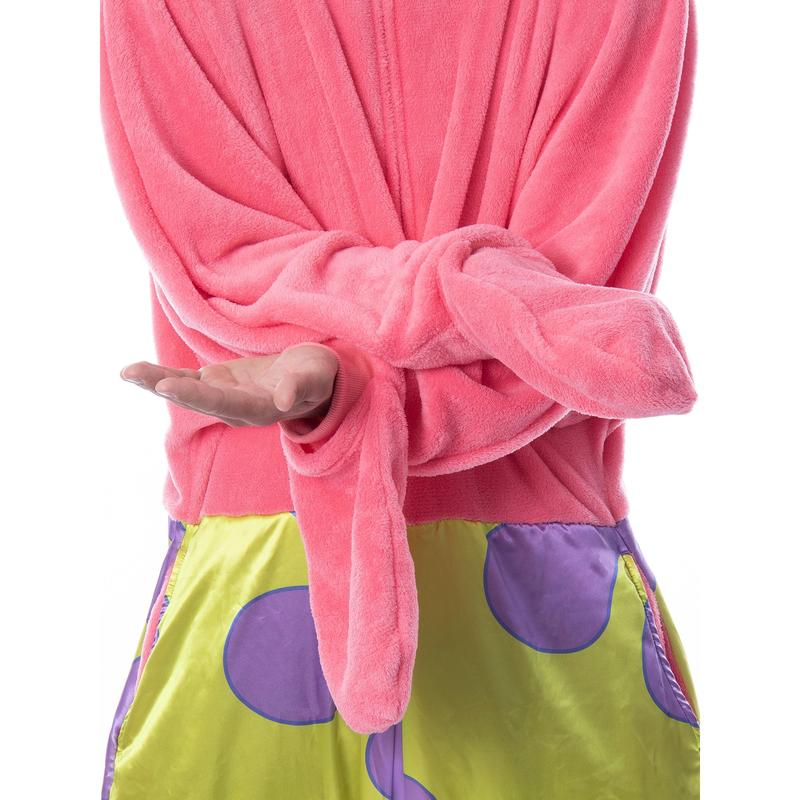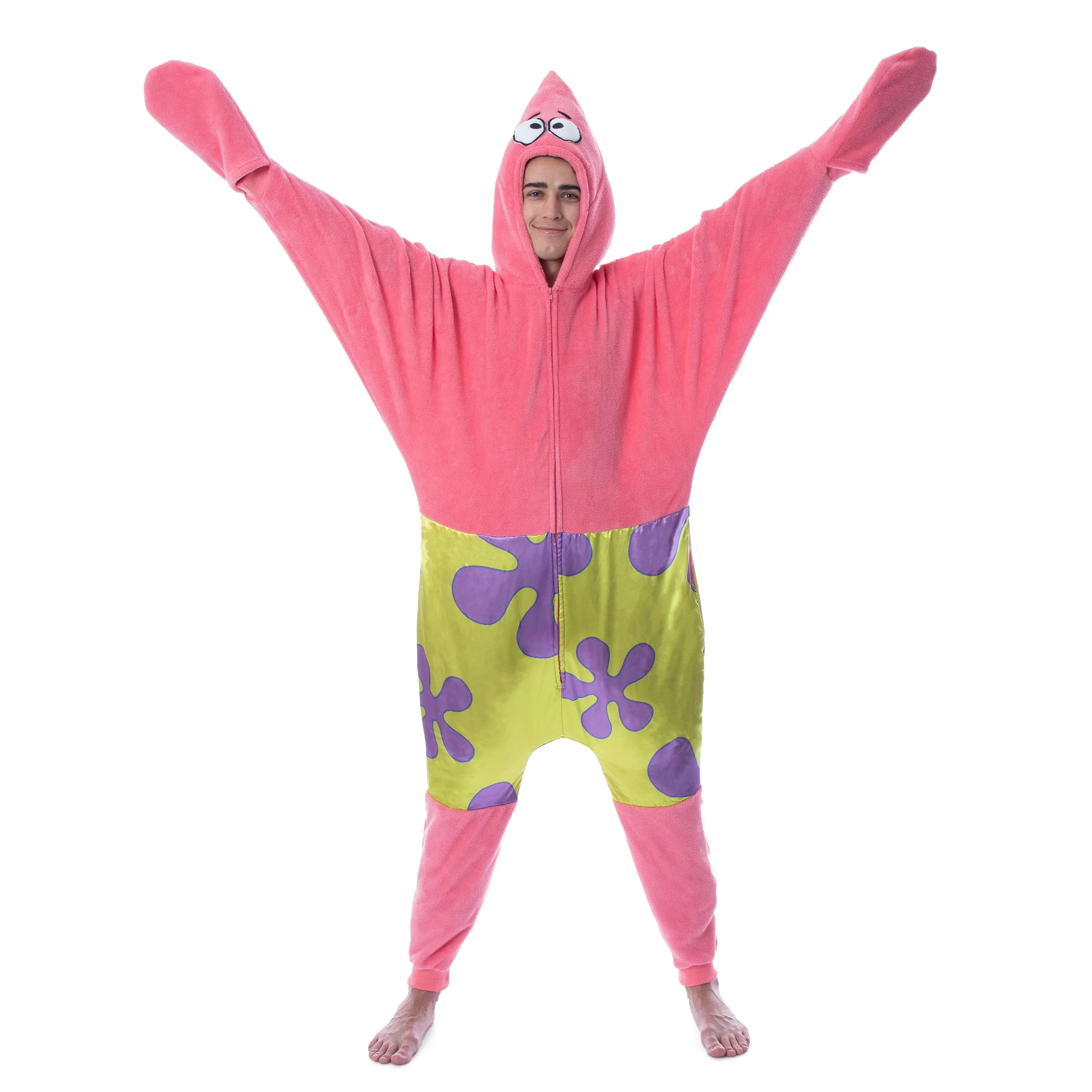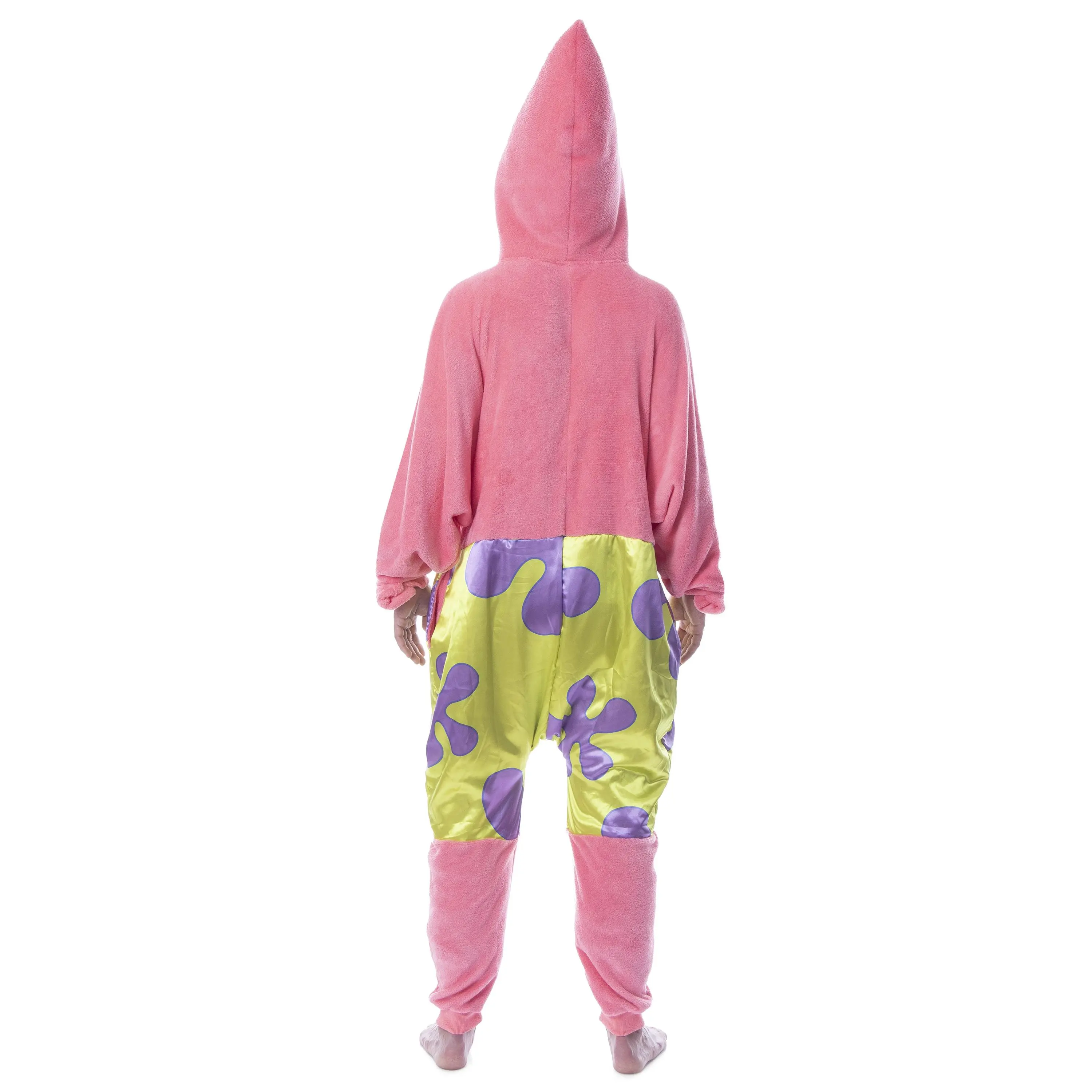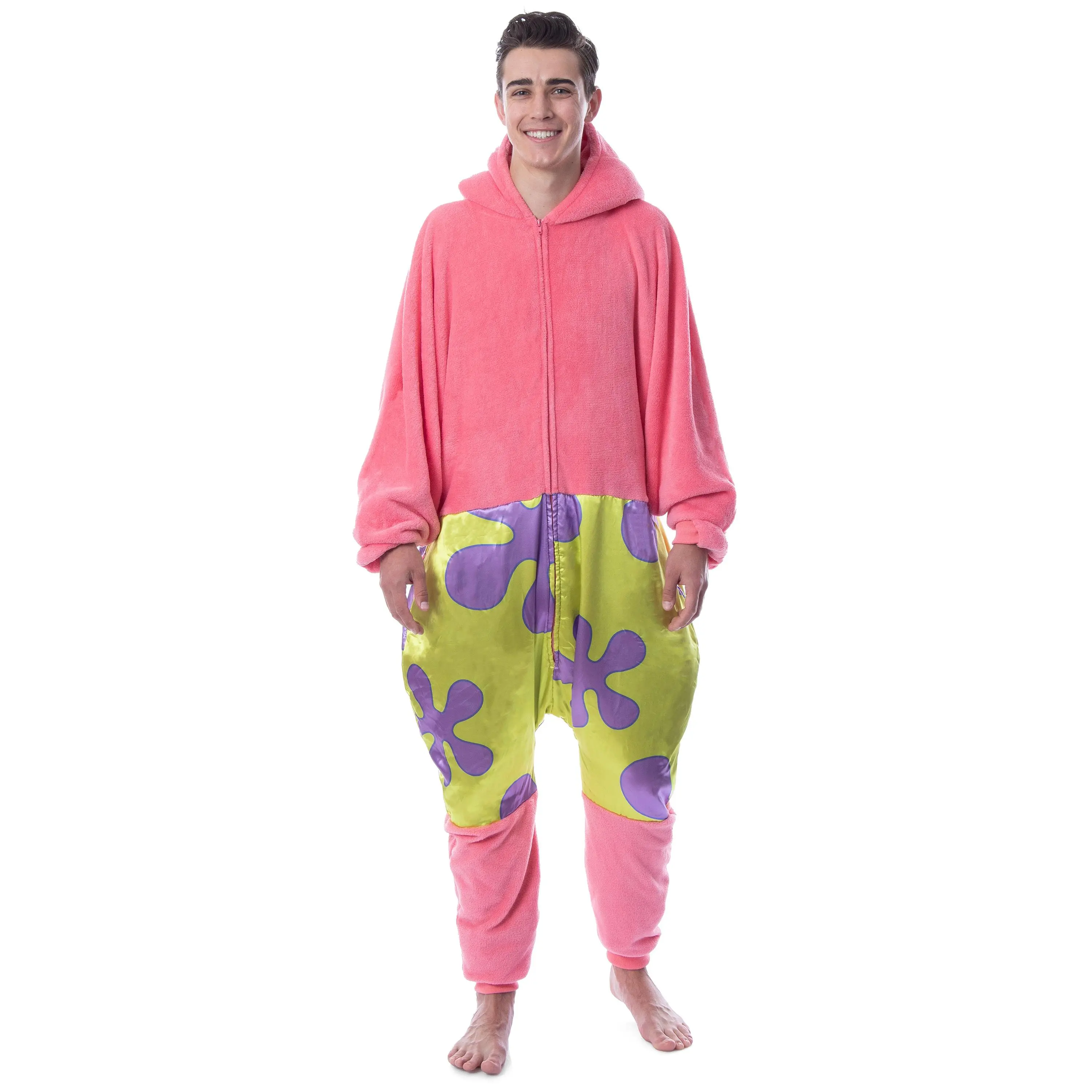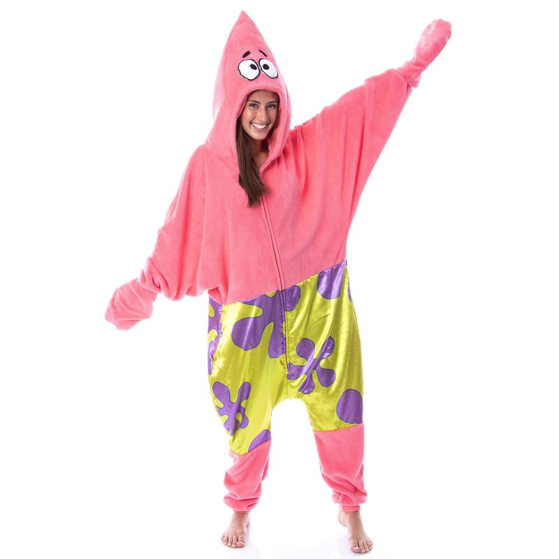 SpongeBob SquarePants is a popular cartoon series that aired on Nickelodeon. With characters like Patrick, Star, Squidward, Sandy Cheeks, Plankton, Mr. Krabs, and Gary the Snail, it is hard not to love! This SpongeBob SquarePants pajama features a Patrick Star character costume design, including a 3D face on the partially stuffed hood. The union suit also features pockets, covered hands, and ribbed fabric on the ankles and wrists.