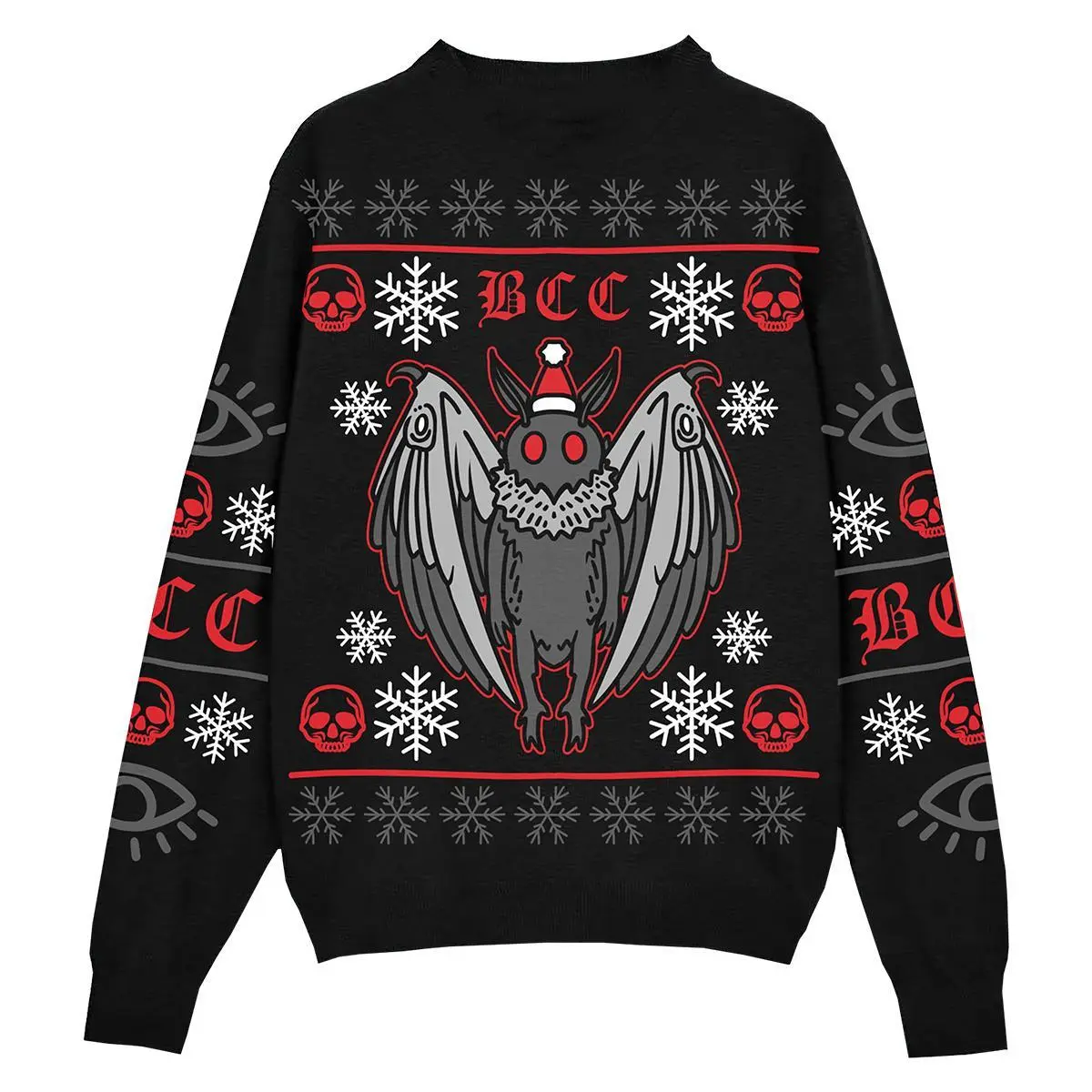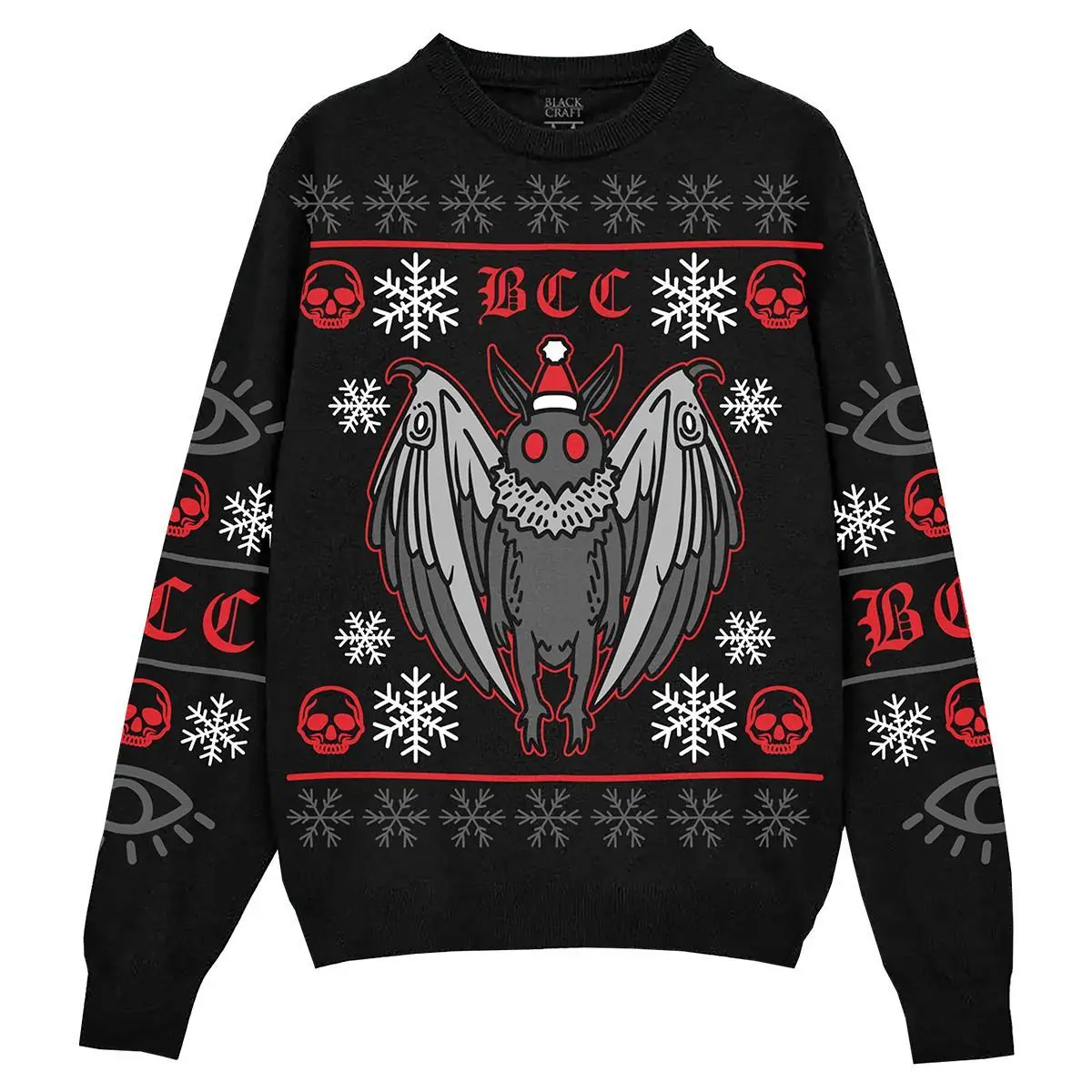 Spooky Mothman Holiday Sweater now available! #sweater #blackcraftcult  A relaxed fit, unisex jacquard knit sweater that brings a dark twist to the traditional holiday knit. Designed with a custom spooky Mothman motif, this piece is cozy enough for the season and wicked enough to stand out at any ugly Christmas sweater party. 100% acrylic Jacquard knit Unisex fit Crew neckline Long sleeves Ribbed collar, cuff, and bottom hem