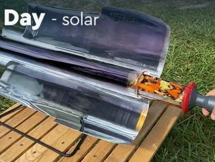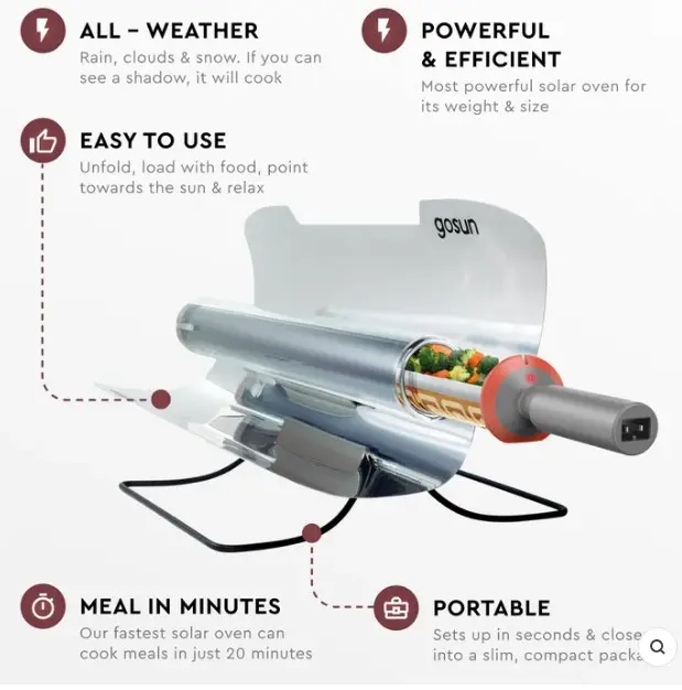 Breakthrough Hybrid Solar Oven that can cook at night. Harness the Sun to cook food during the day and/or use 12V electricity to cook at night or indoors. Cook fuel-free meals in 20 minutes to feed two people. Vacuum insulated oven is cool to touch on outside while oven temps remains 350°F. Plug into any 12 volt DC power source or a GoSun Power Bank. Package includes Carrying Case, 8 x Silicone Trays, and Powercord.