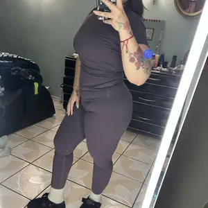 Cute go to OOTD good for running errands and going to the gym for a workout. Comfy and stretchy material. I got the largest size. 5’4 215