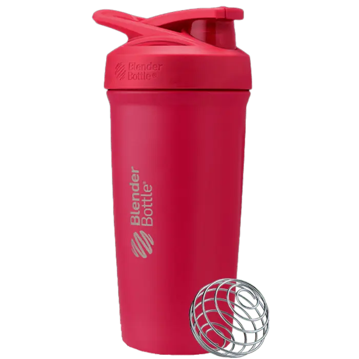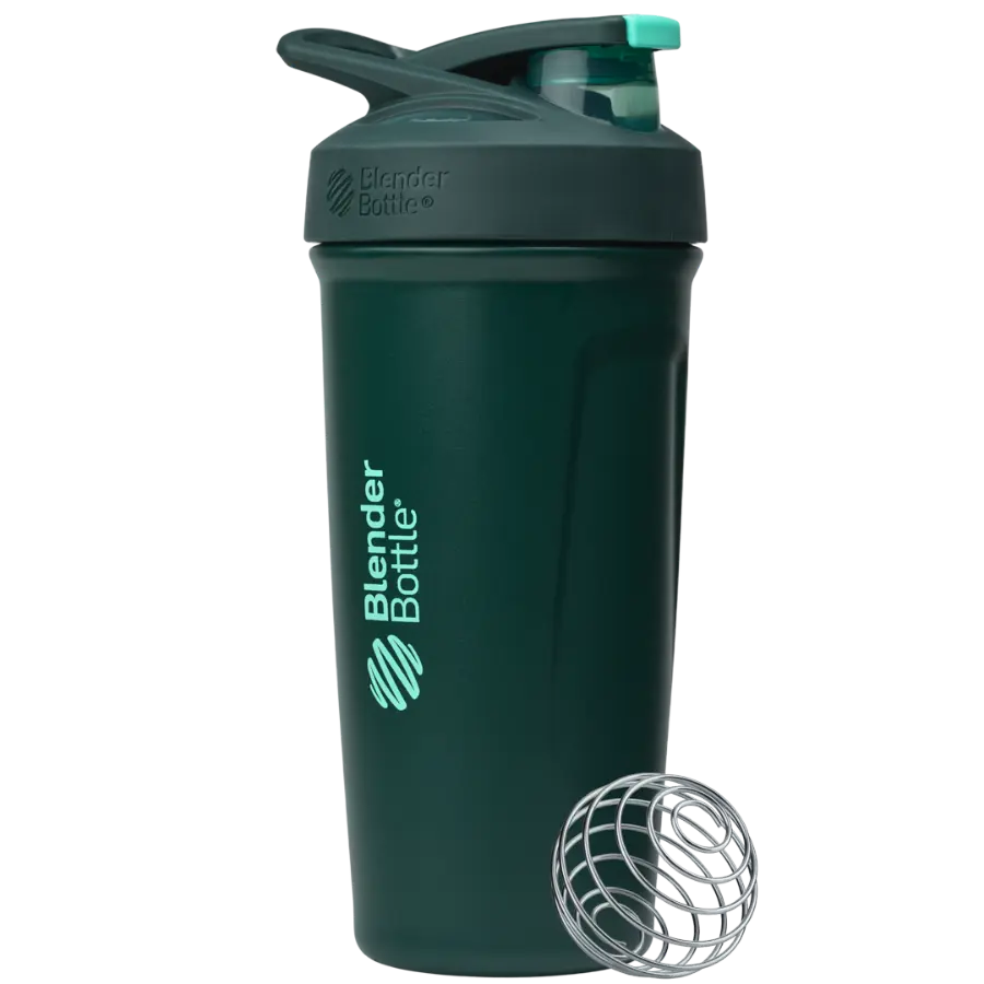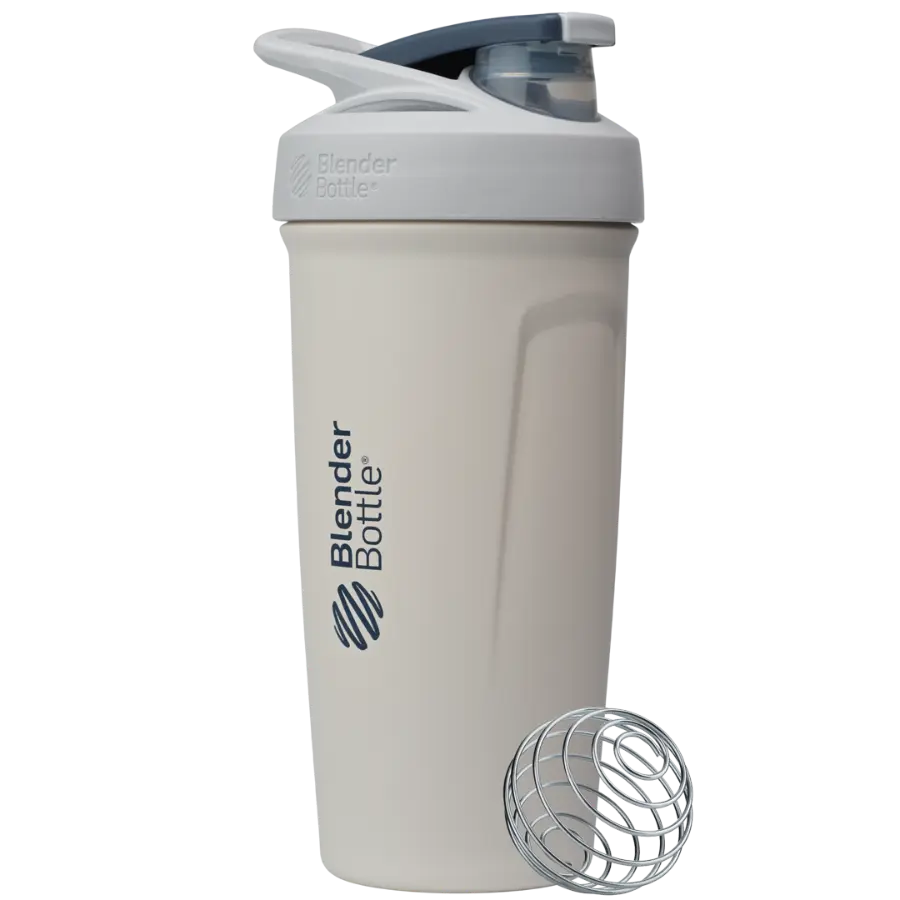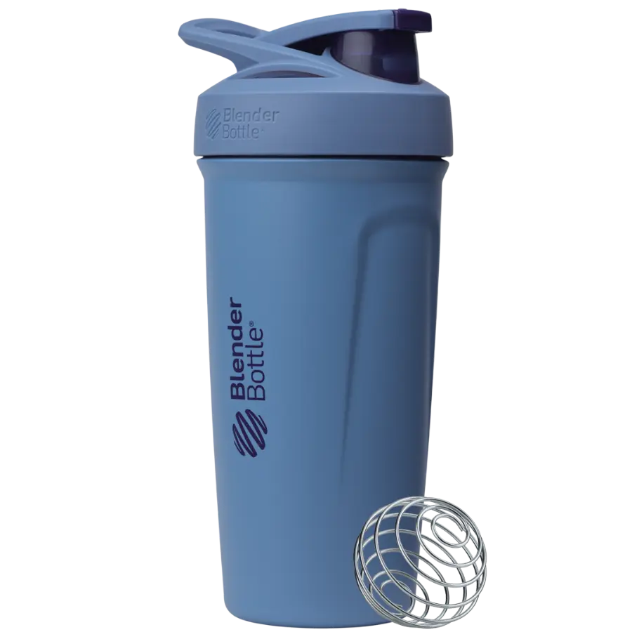 The BlenderBottle Stainless Steel Sport push-button insulated protein shaker provides sleek style and ultimate ease. The shaker bottle’s spill-proof locking lid opens and closes with the touch of a button. A flexible, ergonomic carry loop provides a comfortable hold. The patented mixing system utilizes the BlenderBall wire whisk to mix even the most stubborn protein powder, and a rounded base ensures a smooth blend. Double-wall insulated stainless steel keeps drinks cold for up to 24 hours. Measurement markings on the inside of the bottle add to the ease of creating perfect protein shakes. Leak proof; top-rack dishwasher safe; BPA and phthalate free. Manufacturer’s limited lifetime warranty.