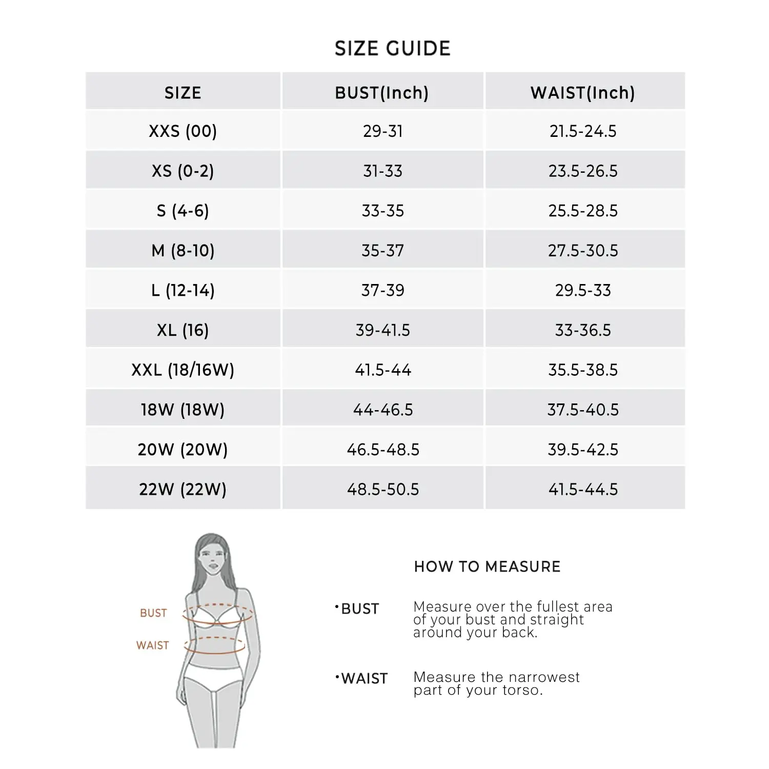 ·We offer different US sizes to choose from, including XXS(US 00), XS(US 0-2), S(US 4-6), M(US 8-10), L(US 12-14), XL(US 16), XXL(US 18), 18 Plus, 20 Plus, 22 Plus. Please choose your size according to the following detailed size measurement.