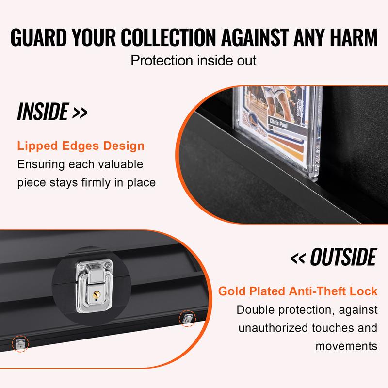 ·Ultimate Protection Inside and Out: Our sports card display case features soft black felt lining on the interior, shielding cards from scratching while maintaining a dry environment with excellent moisture absorption. On the exterior, two gold-plated anti-theft locks deter unauthorized touching or movement by others. Elevate your showcasing experience with peace of mind.