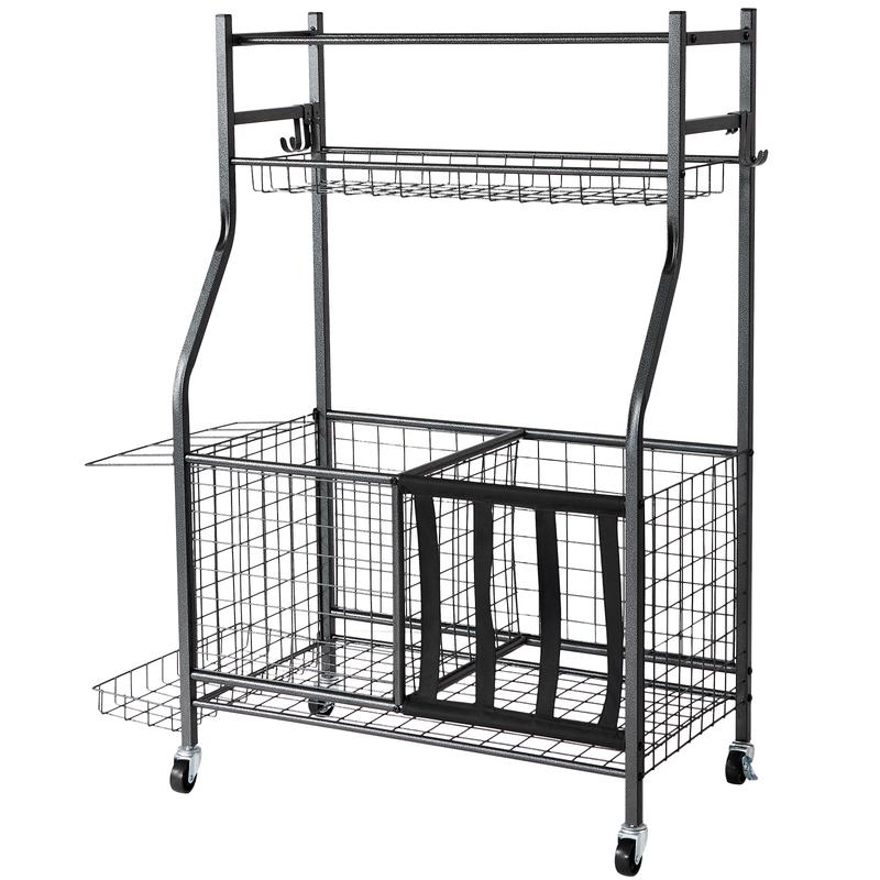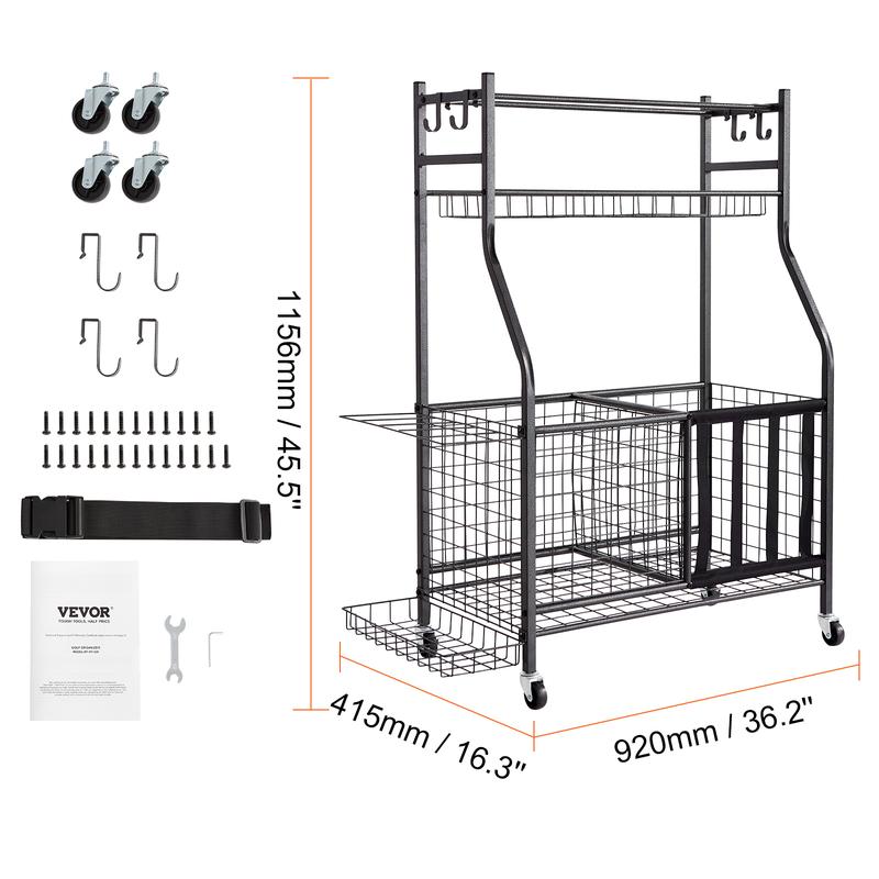 5. VEVOR Sports Equipment Garage Organizer, Rolling Ball Storage Cart on Wheels, Basketball Rack with Baskets & Hooks, Indoor/Outdoor Sports Gear and Toys Storage, Steel Sports Equipment Organizer, Black