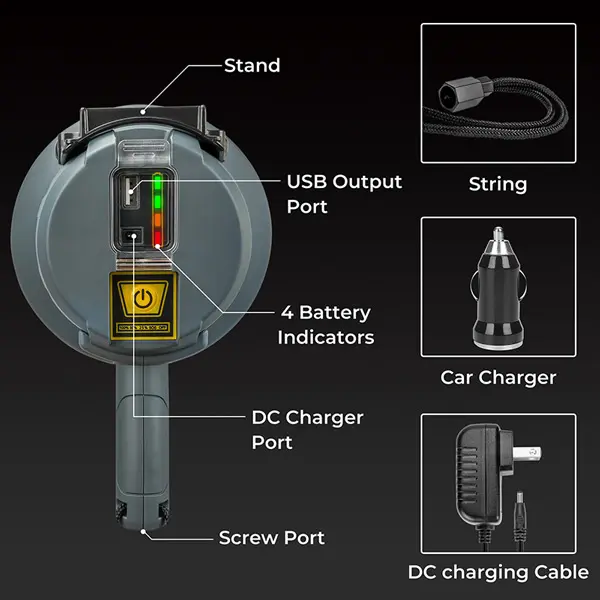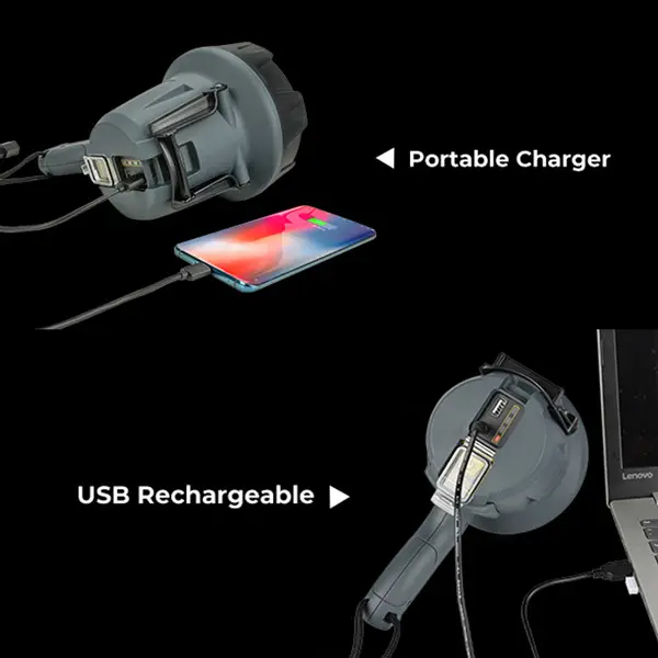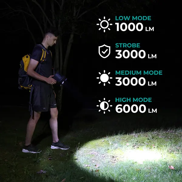 This handheld rechargeable LED spotlight casts 6000 lumens of brilliant wide-area light and has an ultra-long illumination range of up to 900 meters. It has four lighting modes for any condition of use.