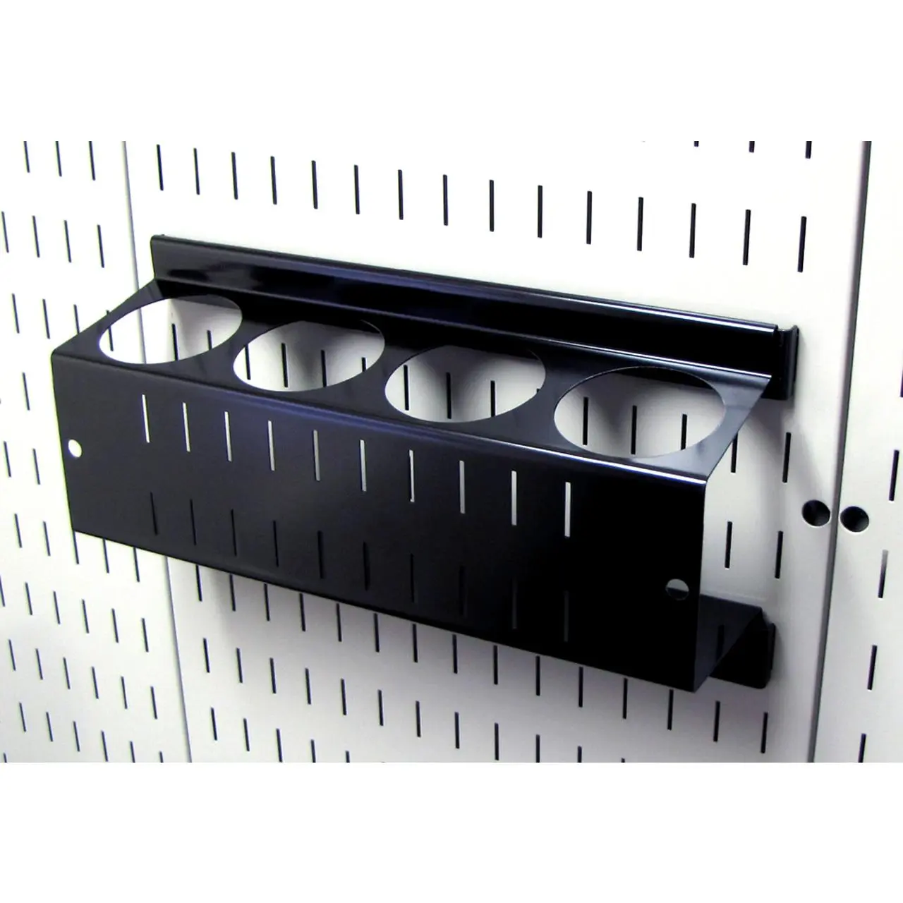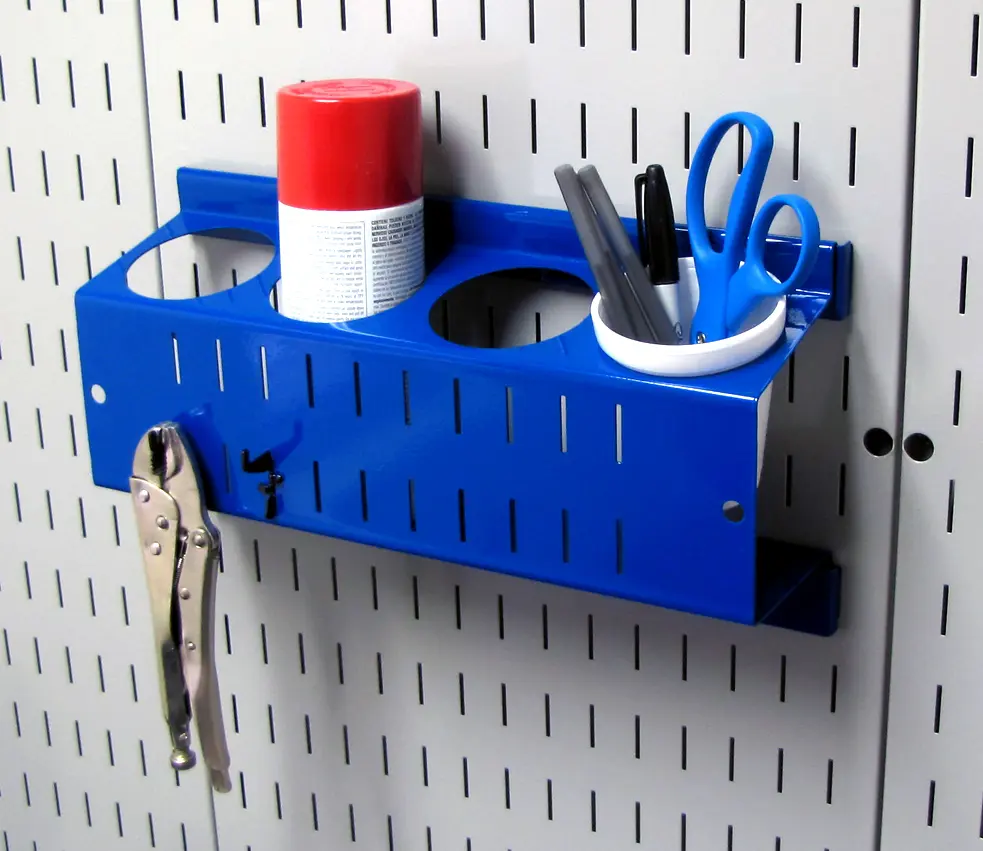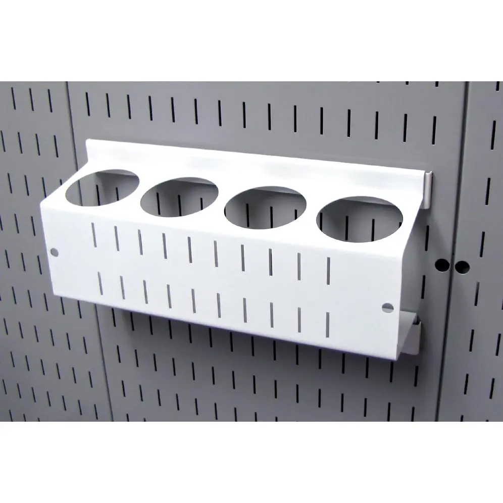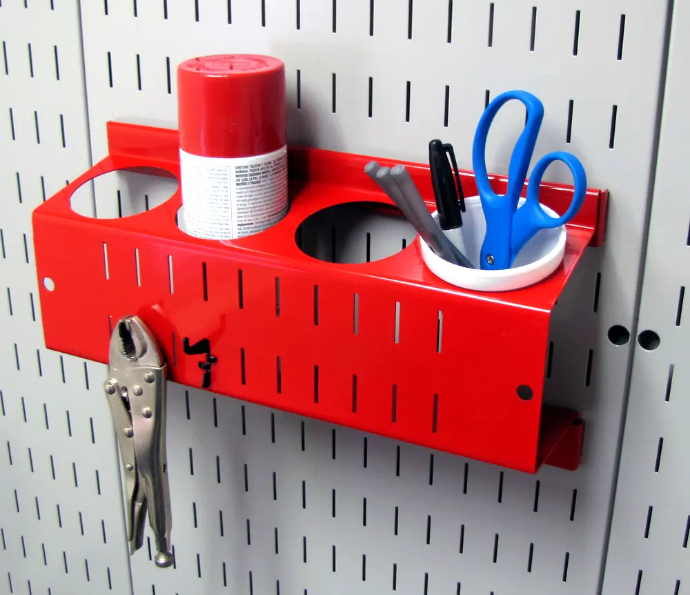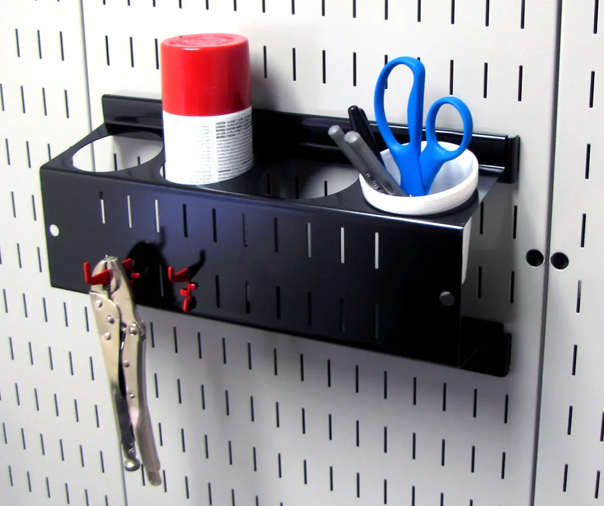 The Wall Control Pegboard Spray Paint Can Holder Bracket and Aerosol Can Organizer for Wall Control's Pegboard and Slotted Tool Board is made from heavy duty 14 gauge steel and offers great pegboard storage and organization for conventional spray cans and aerosol cans. The pegboard spray can holder features four 2-3/4in diameter x 4in deep holes for storing and organizing spray paint cans and aerosol cans of conventional diameter. In addition to storing spray cans on pegboard, the spray paint can pegboard organizer also allows for tool storage on the face of the bracket by accepting Wall Control Slotted Tool Board Hooks. The pegboard Spray Can Organizer is also great for storing pens, paint brushes, scissors, and other items that would typically be stored in a cup or cylindrical organizer. Whether you are trying to get the garage tool wall organized or create a toiletry wall storage solution in a bathroom, the Wall Control Can Holder Accessory has you covered.