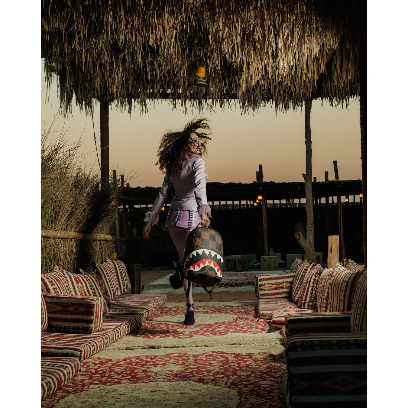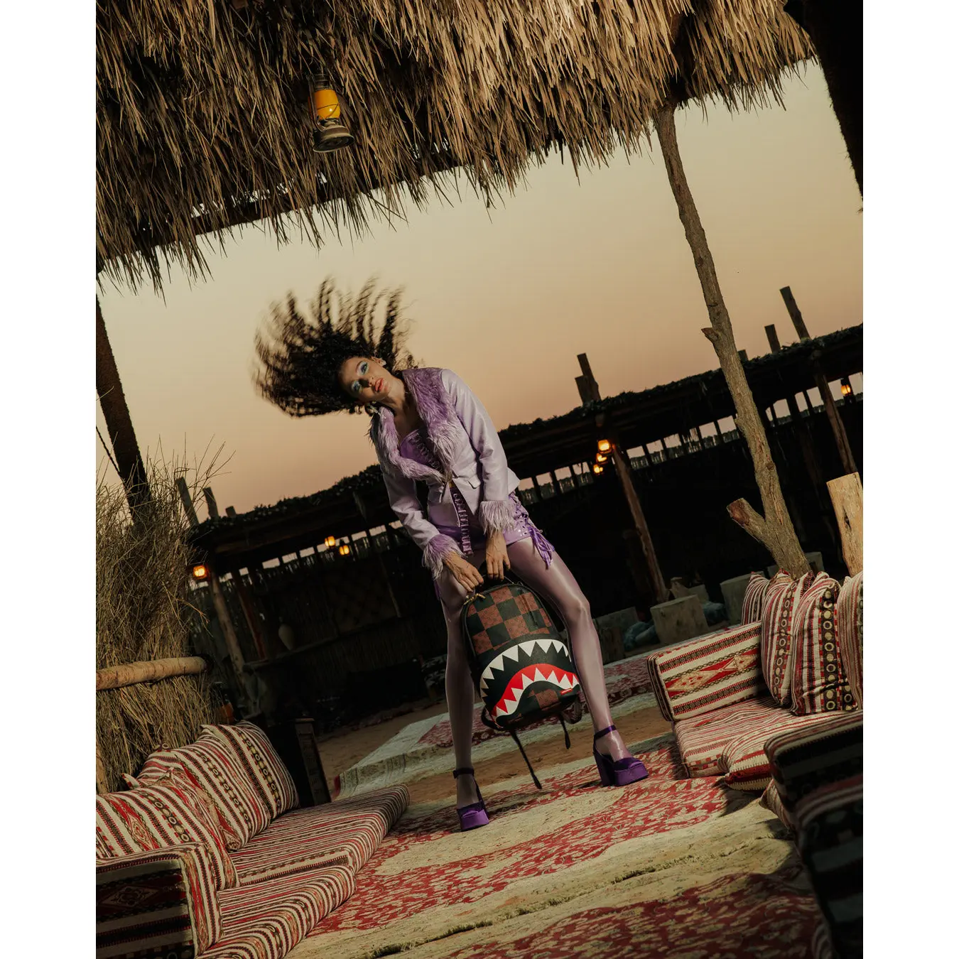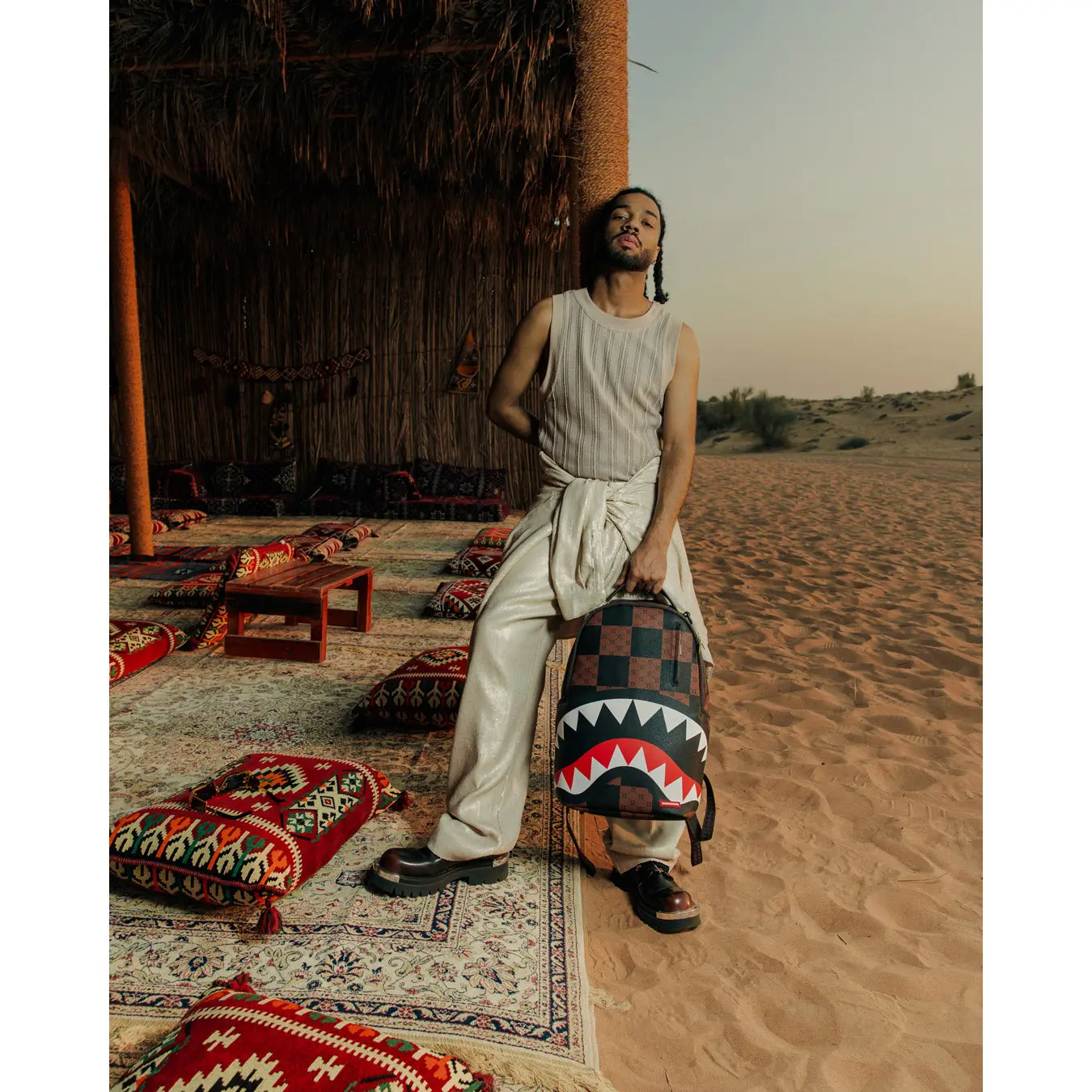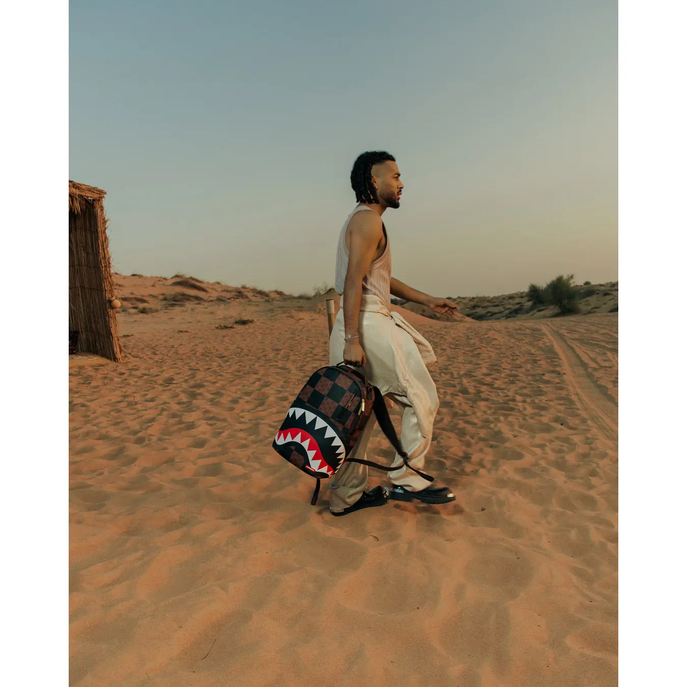 Dimensions: 18" x 6" x 11.5" • Front zipper pocket • Side pockets • Zippered Stash pocket • Separate velour sunglass compartment • Ergonomic mesh back padding • Adjustable Straps for custom sizing • Gold zippers with metal hardware • Metal "Sprayground Authentic" badge • Slide through back sleeve connects to carry-on luggage to free your hands