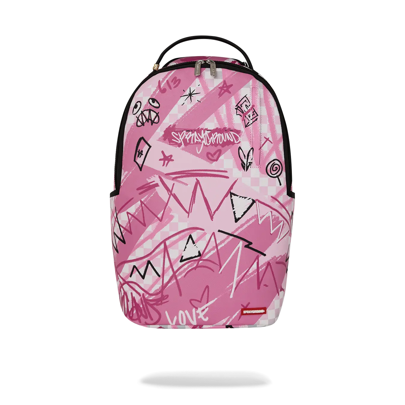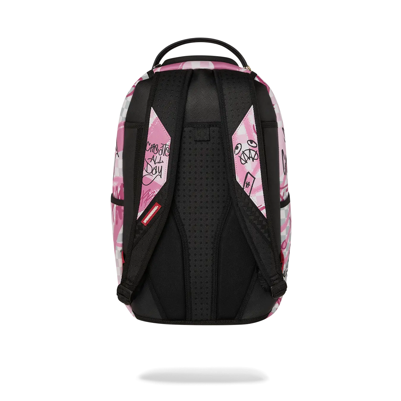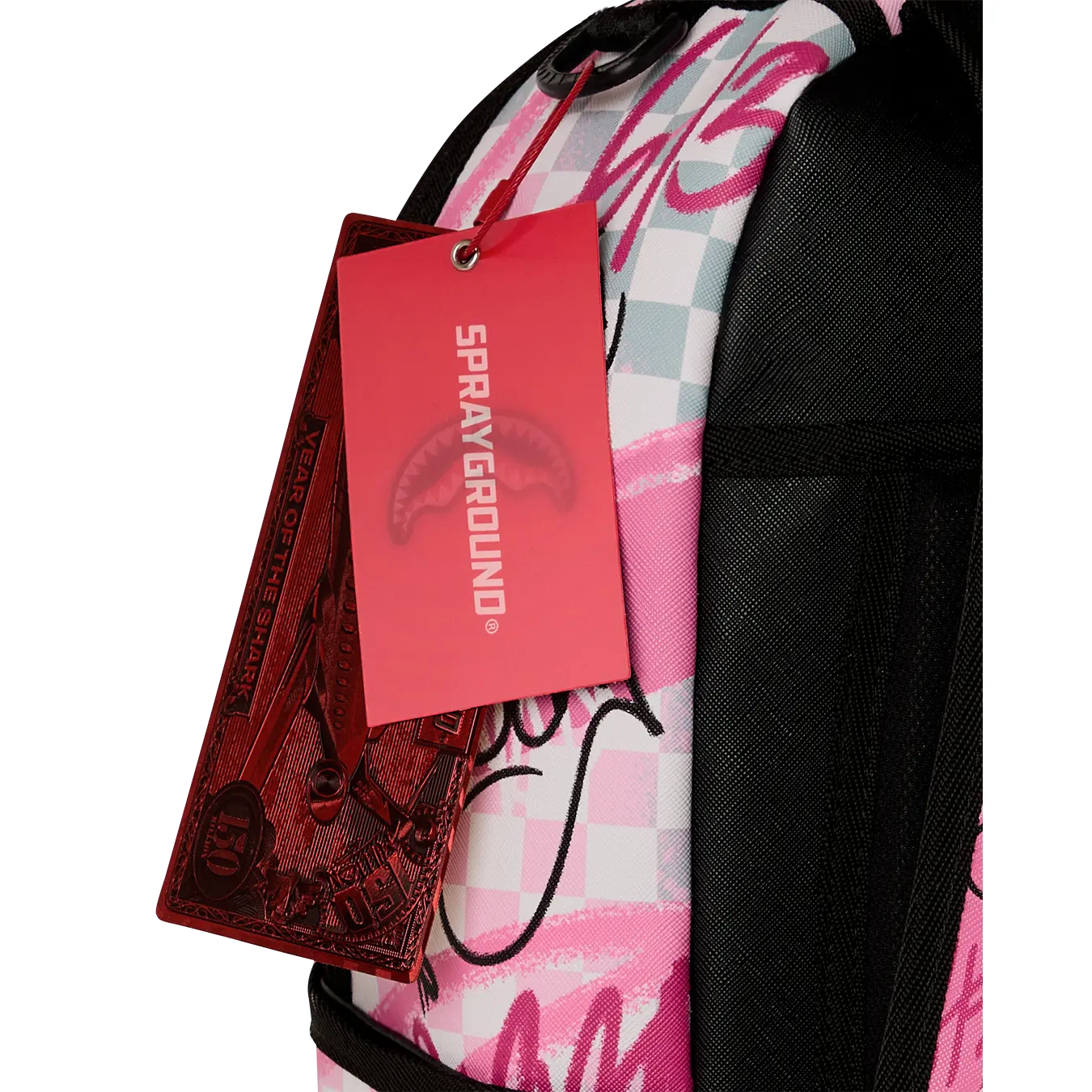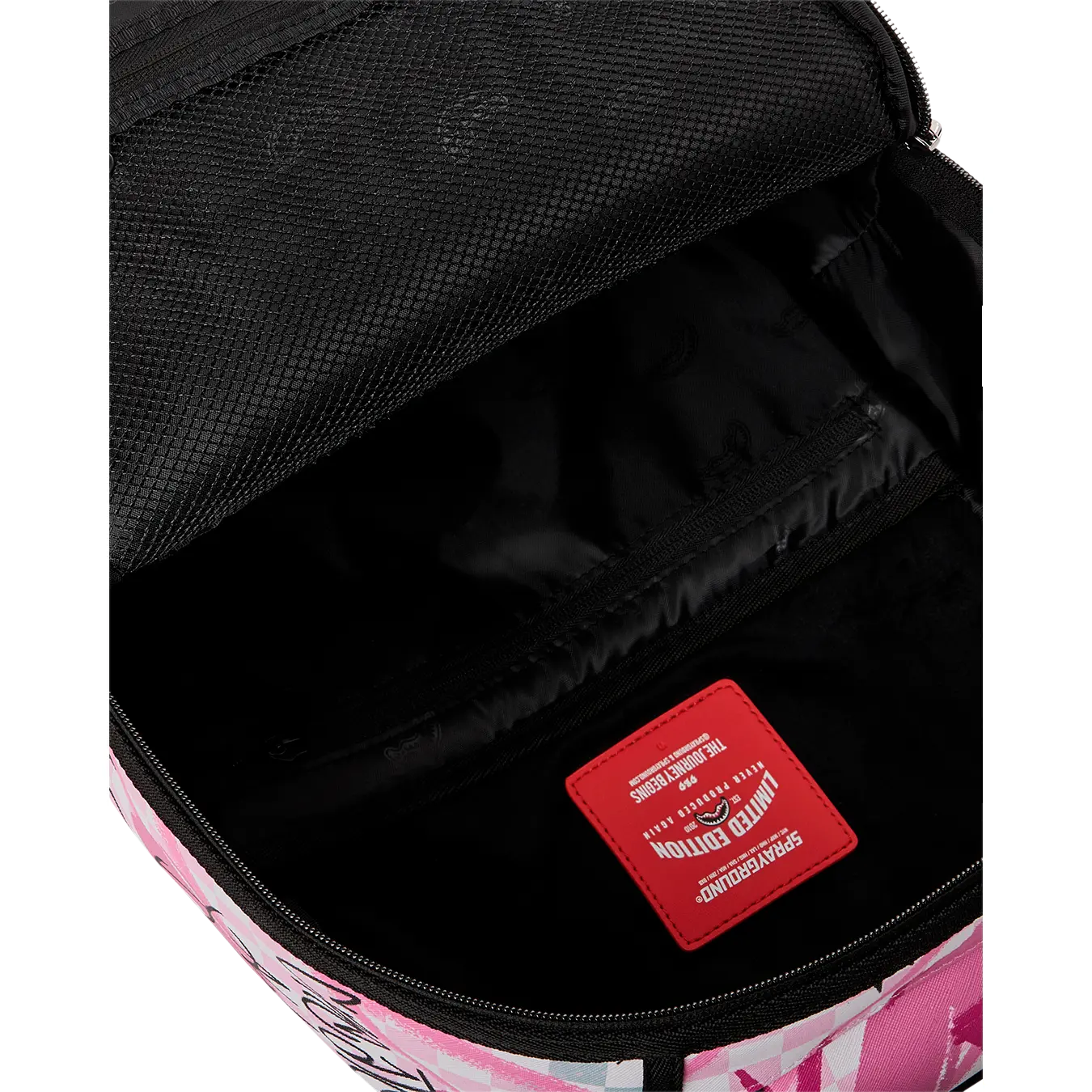 Dimensions: 18" x 6" x 11.5" • Front zipper pocket • Side pockets • Zippered Stash pocket • Separate velour sunglass compartment • Ergonomic mesh back padding • Adjustable Straps for custom sizing • Gold zippers with metal hardware • Metal "Sprayground Authentic" badge • Slide through back sleeve connects to carry-on luggage to free your hands