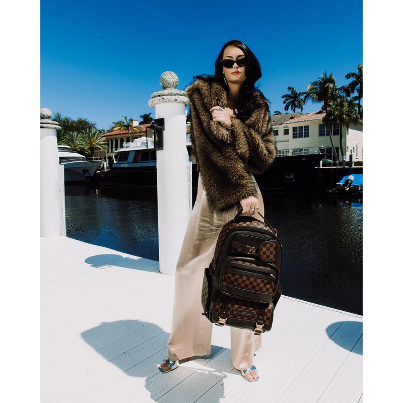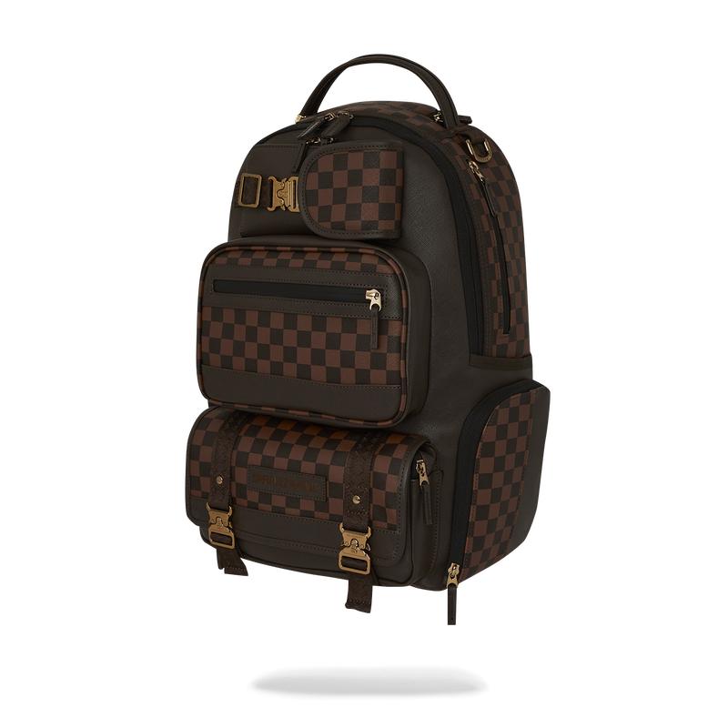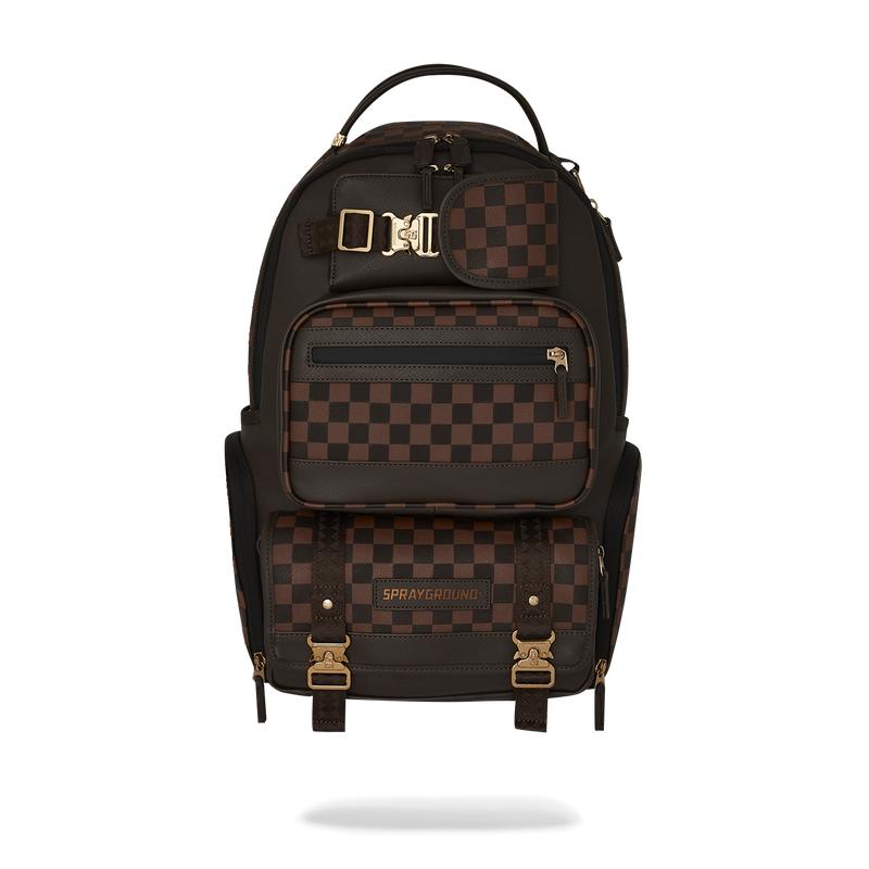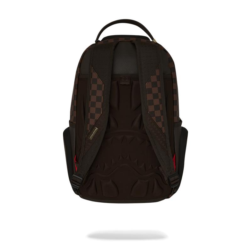 Dimensions: 18" x 6" x 11.5" • Front zipper pocket • Side pockets • Zippered Stash pocket • Separate velour sunglass compartment • Ergonomic mesh back padding • Adjustable Straps for custom sizing • Gold zippers with metal hardware • Metal "Sprayground Authentic" badge • Slide through back sleeve connects to carry-on luggage to free your hands