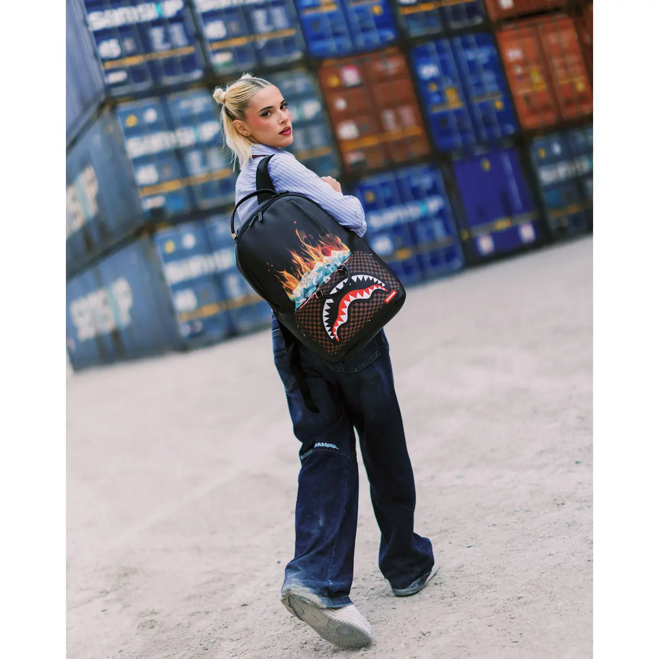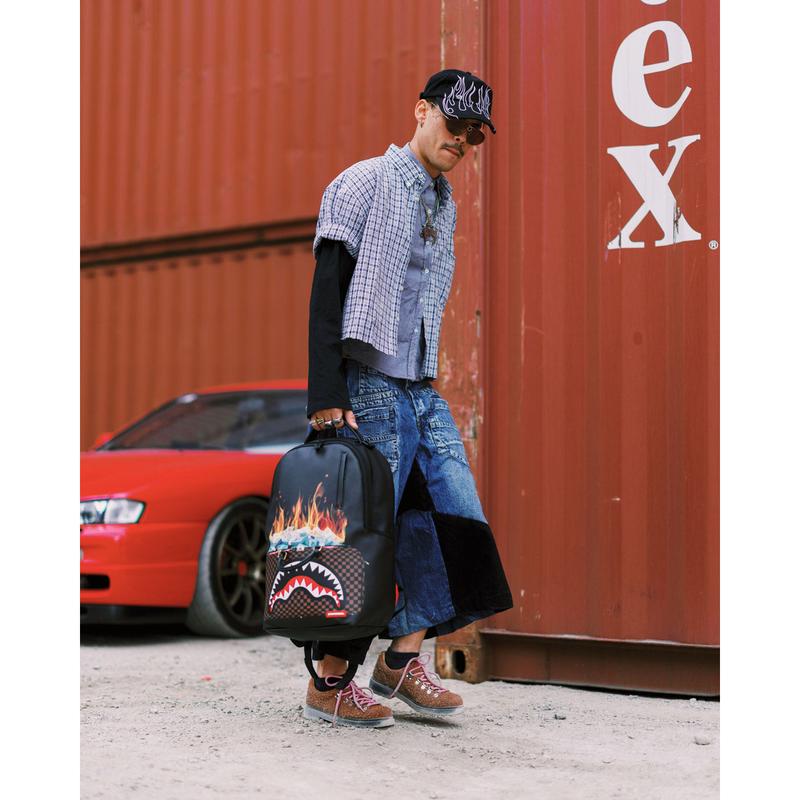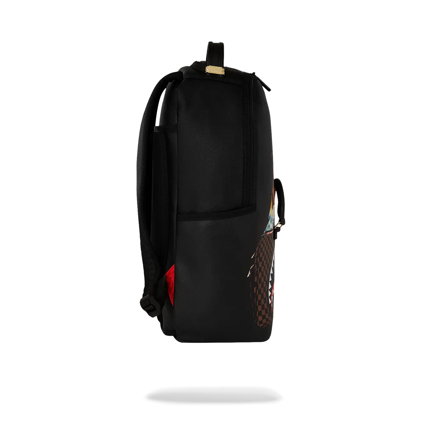 Dimensions: 18" x 6" x 11.5" • Front zipper pocket • Side pockets • Zippered Stash pocket • Separate velour sunglass compartment • Ergonomic mesh back padding • Adjustable Straps for custom sizing • Gold zippers with metal hardware • Metal "Sprayground Authentic" badge • Slide through back sleeve connects to carry-on luggage to free your hands